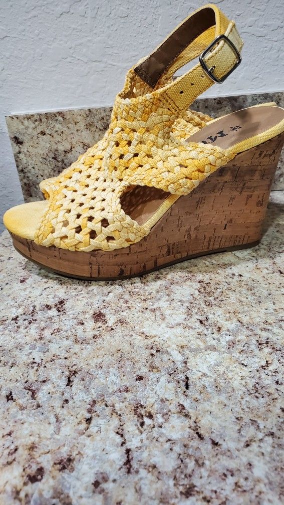 Mudd brand high heeled wedge sandals. Never worn. Taffy yellow color. Size 6. Needs to go. I have way too many shoes. Pick up only off Sleepy Hill Rd North Lakeland.