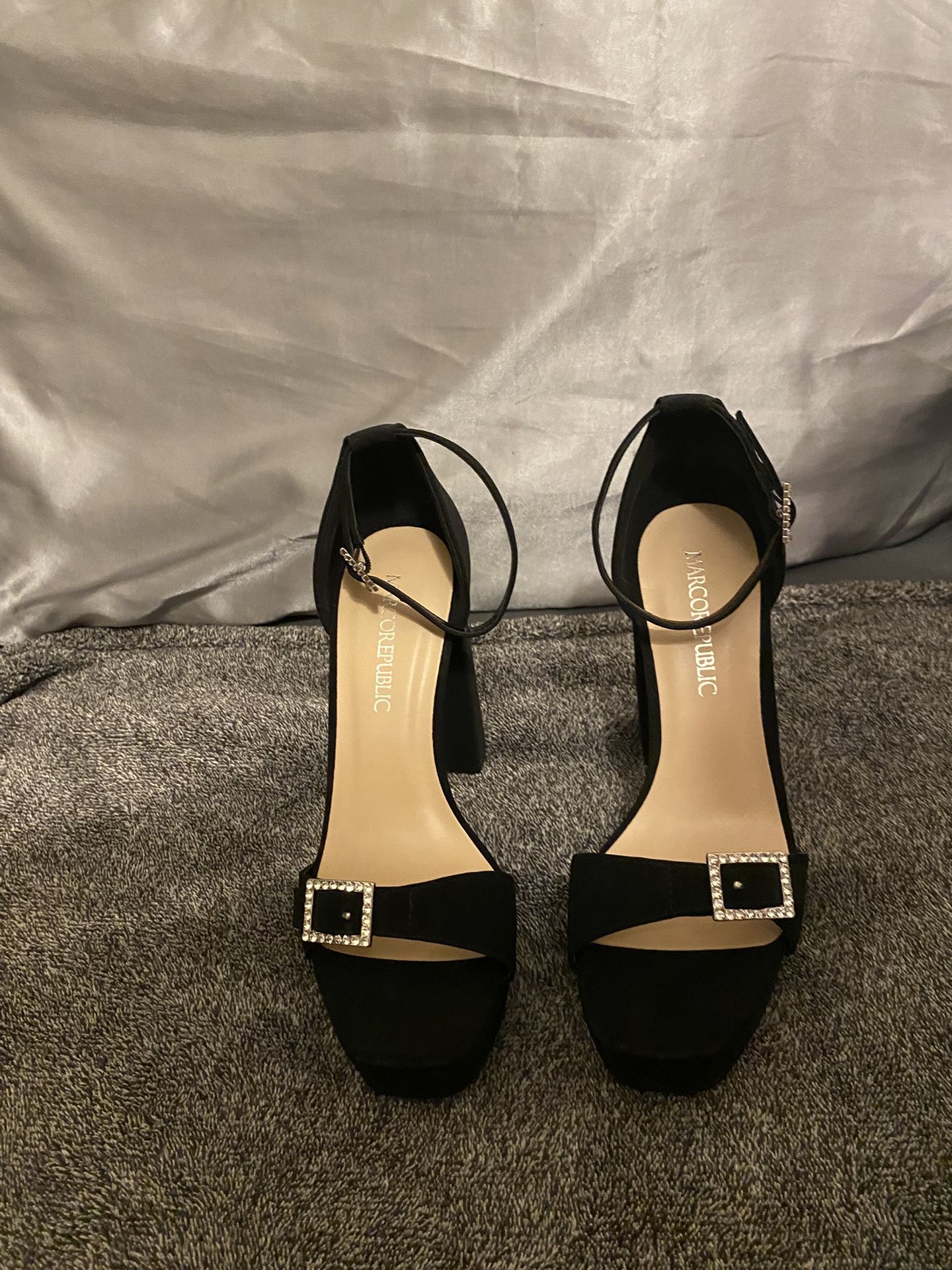 Elegant black open-toe heels with a sturdy block heel and ankle strap for comfort and stability. Features rhinestone square buckle details on the toe strap and ankle strap for a classy touch of sparkle. Perfect for nights out, weddings, parties. (Size 5.5 in Women’s) If you’re seeing this listing, it’s available for porch pickup only. I use Venmo, Zelle or cash. No holds without pre-payment. Please give me a specific time for pickup.