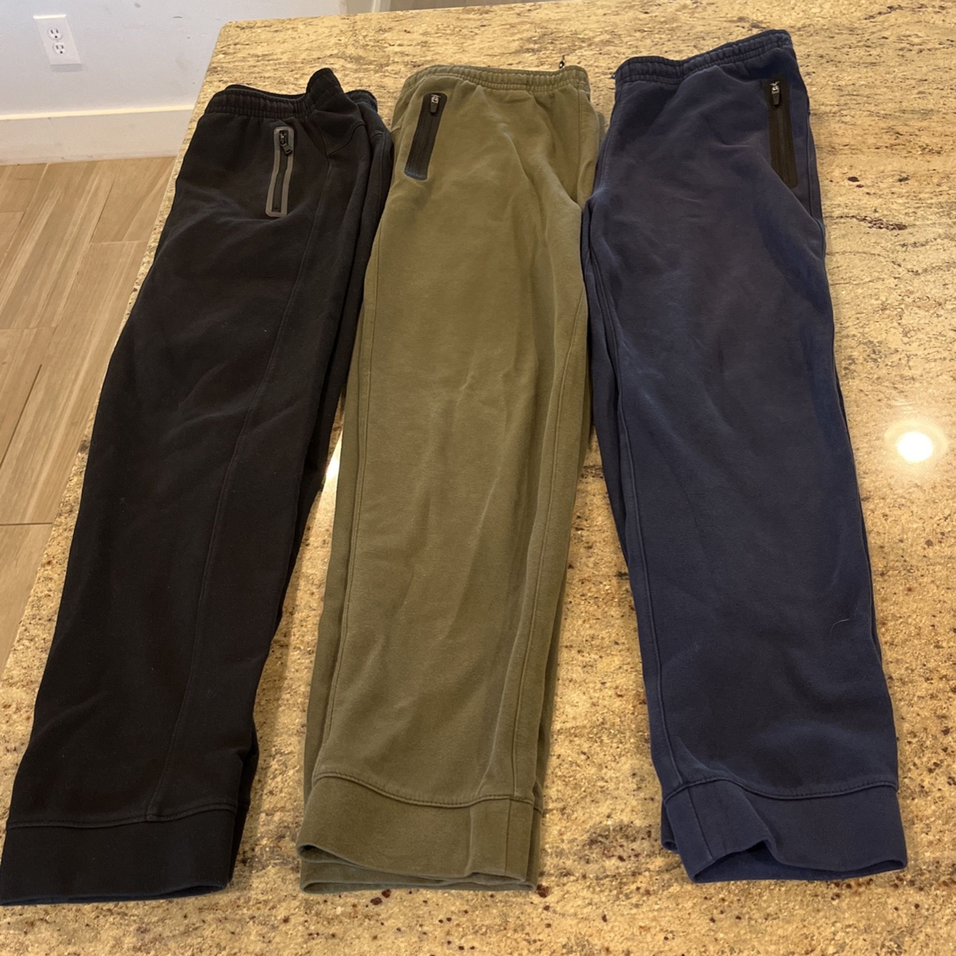 3 pair size XXL (16-18) plus or husky Navy blue, black and green Two zipper pockets on the front and a drawstring inside. All 3 for $15