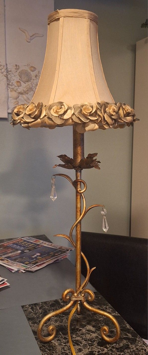 Beautiful antique style table lamp. Copperish/Goldish colors. A must see. 29 inches tall, shade is 12 inches wide $30 cash firm Includes 3 extra Lamp Shades with purchase