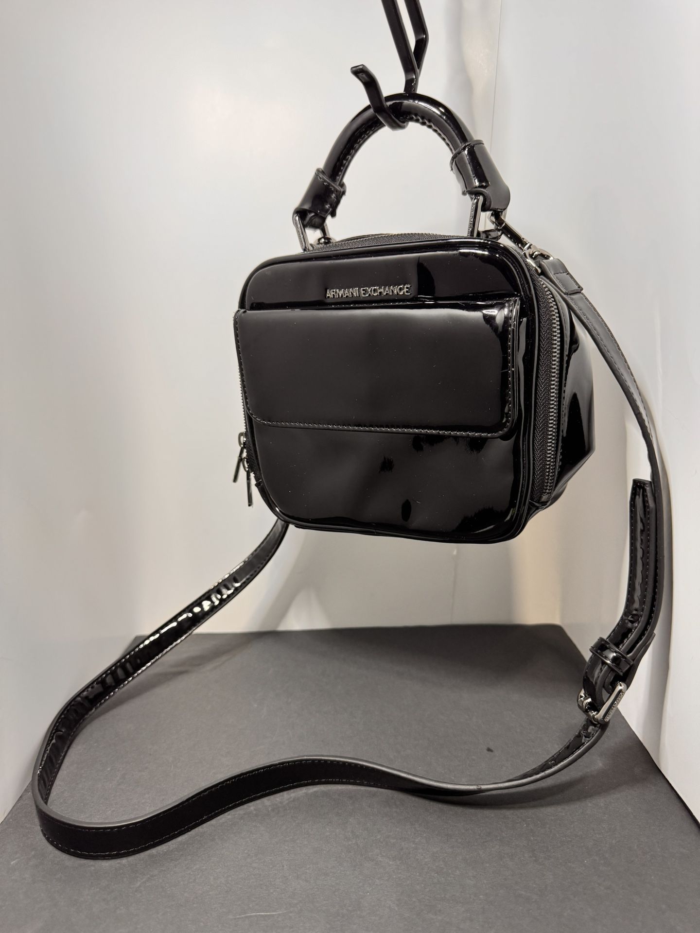 patent leather bag from A|X Armani Exchange. This specific model features a high-shine finish, a structured boxy silhouette, a top handle, and an adjustable crossbody strap. Product Details Brand: A|X Armani Exchange. Material: Shiny patent leather (often referred to as "enamel black" in some markets). Features: Front flap pocket with magnetic closure, silver-tone logo plaque, and a main compartment with a top zip fastening. Style: It is categorized as a shoulder bag or crossbody bag, often noted for its "vintage-inspired" or Y2K aesthetic.