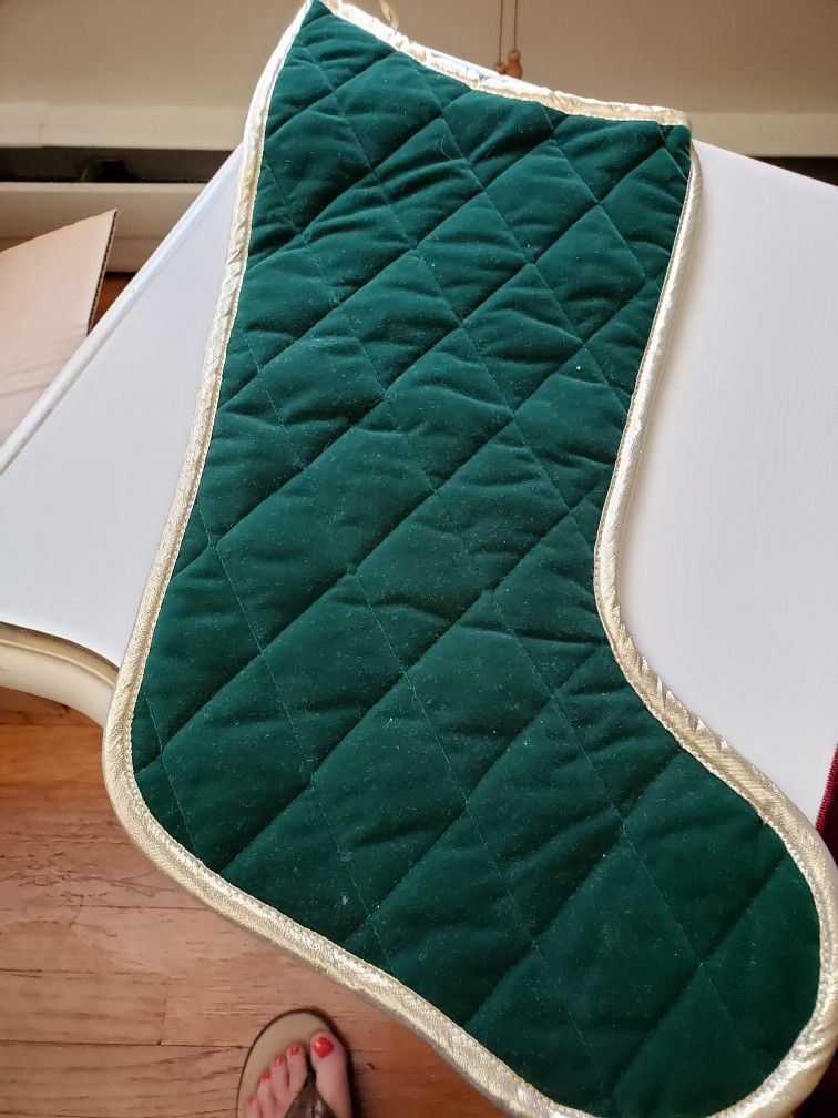 Vintage Christmas Stockings. One stocking is green velvet with gold piping. The other is green/red plaid . In good vintage condition.