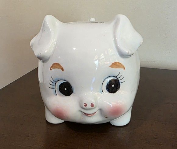 Vintage ceramic planter & piggy bank with stopper fashioned as a white pig. Produced by Rubens Originals. White ceramic body with a pale blue painted ribbon. Mid-century kitsch style, typically from the 1950s or 1960s. In excellent VINTAGE condition. Stamped Japan #5187. 7" length by 4 1/2" height approximately. Smoke and pet FREE home. Thanks for stopping by. Please check out my other postings.