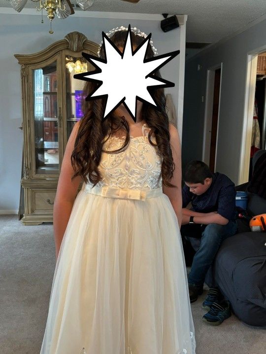 Beautiful flower girl dress. Size 14-16 ivory color. No sleeves. Lace. Worn once.
