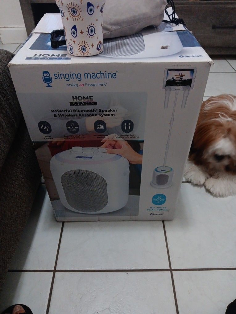 Karaoke singing machine with two microphones and Stan to hold your tablet phone Use maybe once or twice