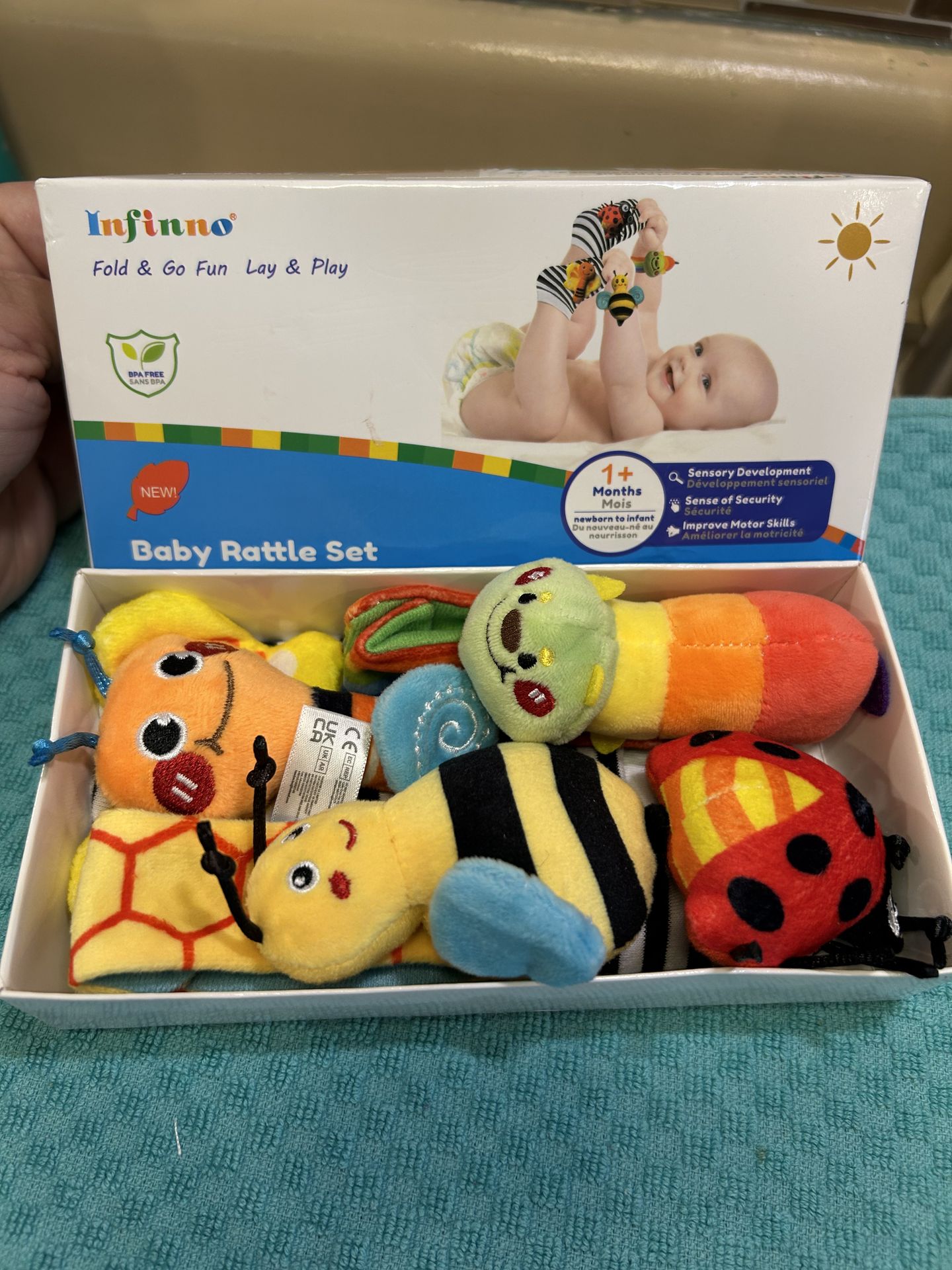 NEW! Infinno Baby Rattle Set, designed for newborns and infants. Product Type: Includes soft wrist rattles and foot finder socks to stimulate sensory development. Target Age: Suitable for babies from 1 month old, aiding in motor skill improvement and sensory exploration. Features: Features high-contrast colors and built-in rattles that make soft sounds when shaking. Safety: Made from safe, soft, BPA-free materials suitable for babies. *** For local sales I meet my buyers in West Mesa at Circle K -located at 1154 W. Rio Salado Pkwy and N. Almaschool Rd. Mesa, AZ 85201