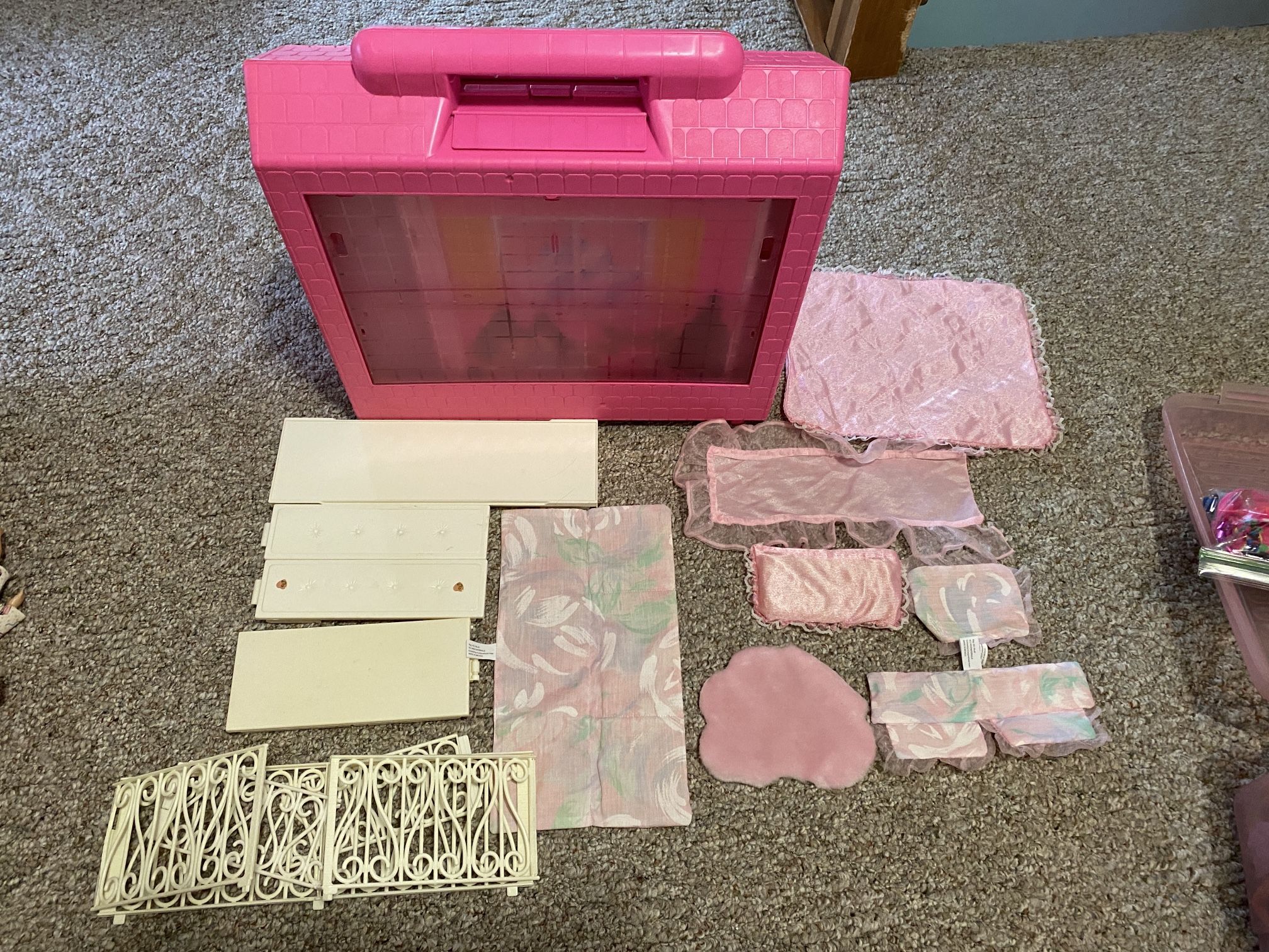 1 folding barbie house 1 folding bed (with bedding, and top opens for storage) 1 folding table (top opens for storage) 2 folding benches (top opens for storage) 1 fur rug 3 fence pieces 1 flower box All pieces in good condition- used with some discoloration. Two broken hinges on house (see photo) but does not affect usage.