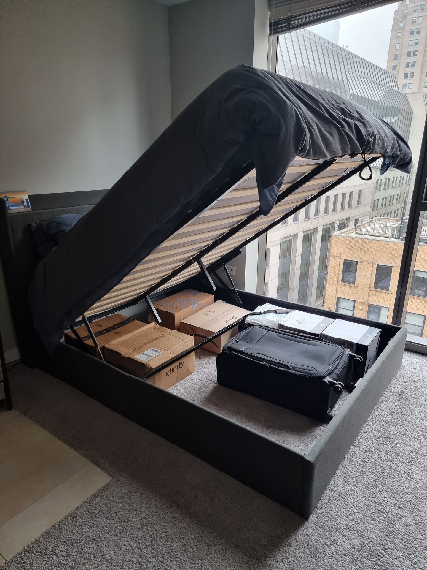 Charcoal Grey Queen Size Bed Frame for sale. Design includes an electrical charging outlet and hydraulic lift for hidden underbed storage (as pictured). Less than 1 year old, has 10 year warranty and in excellent condition. Priced to sell. Can include Queen size mattress and/or bedding linen for additional cost. Pick up only in the Loop.