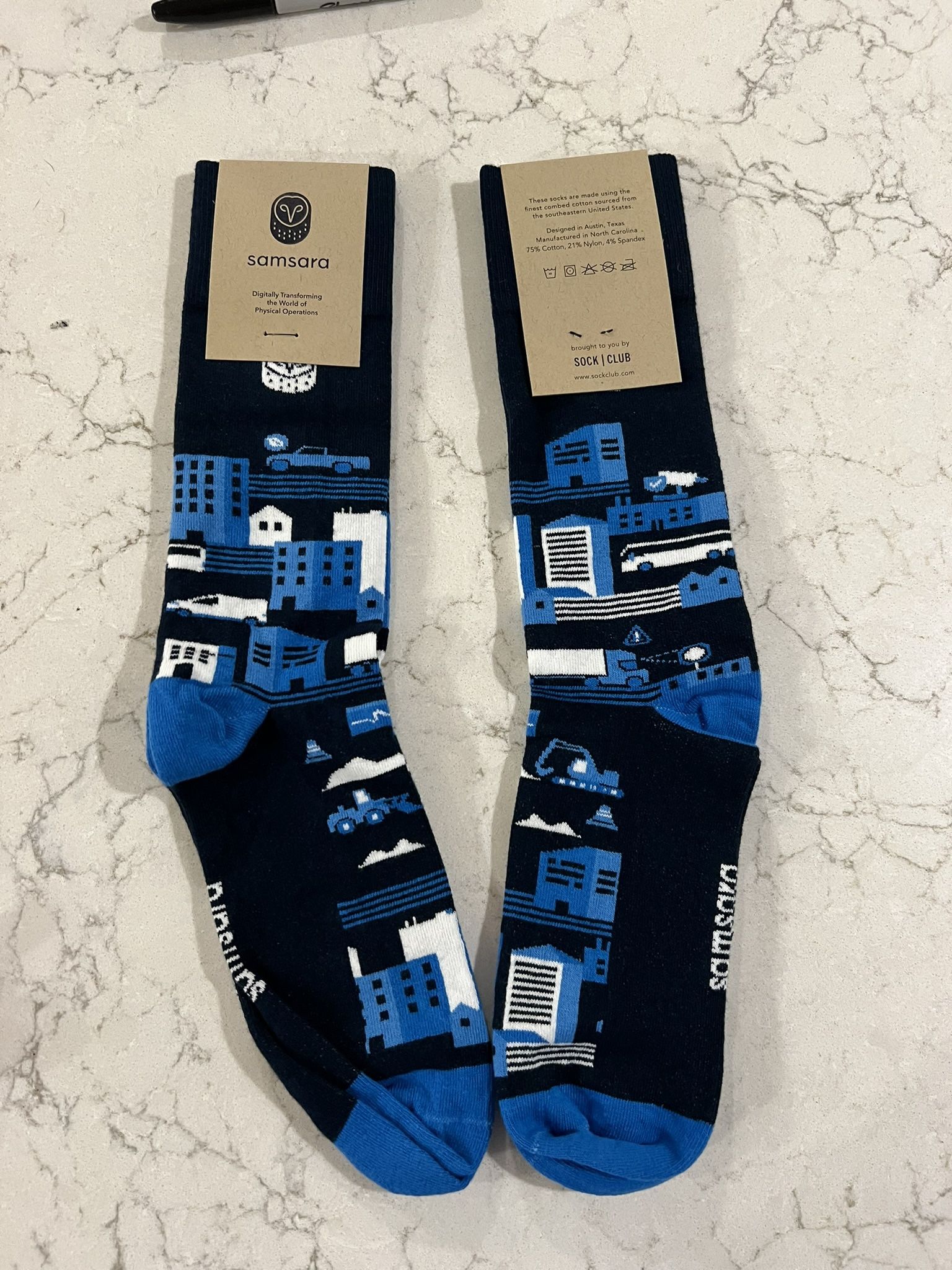 Samsara brand socks $6 Performance Cycling Crew Socks in a blue cityscape pattern. They are new with tags and are listed as one size. The socks are made with a technical yarn blend designed for moisture-wicking and breathability. They feature targeted compression for arch support and a seamless toe construction for comfort