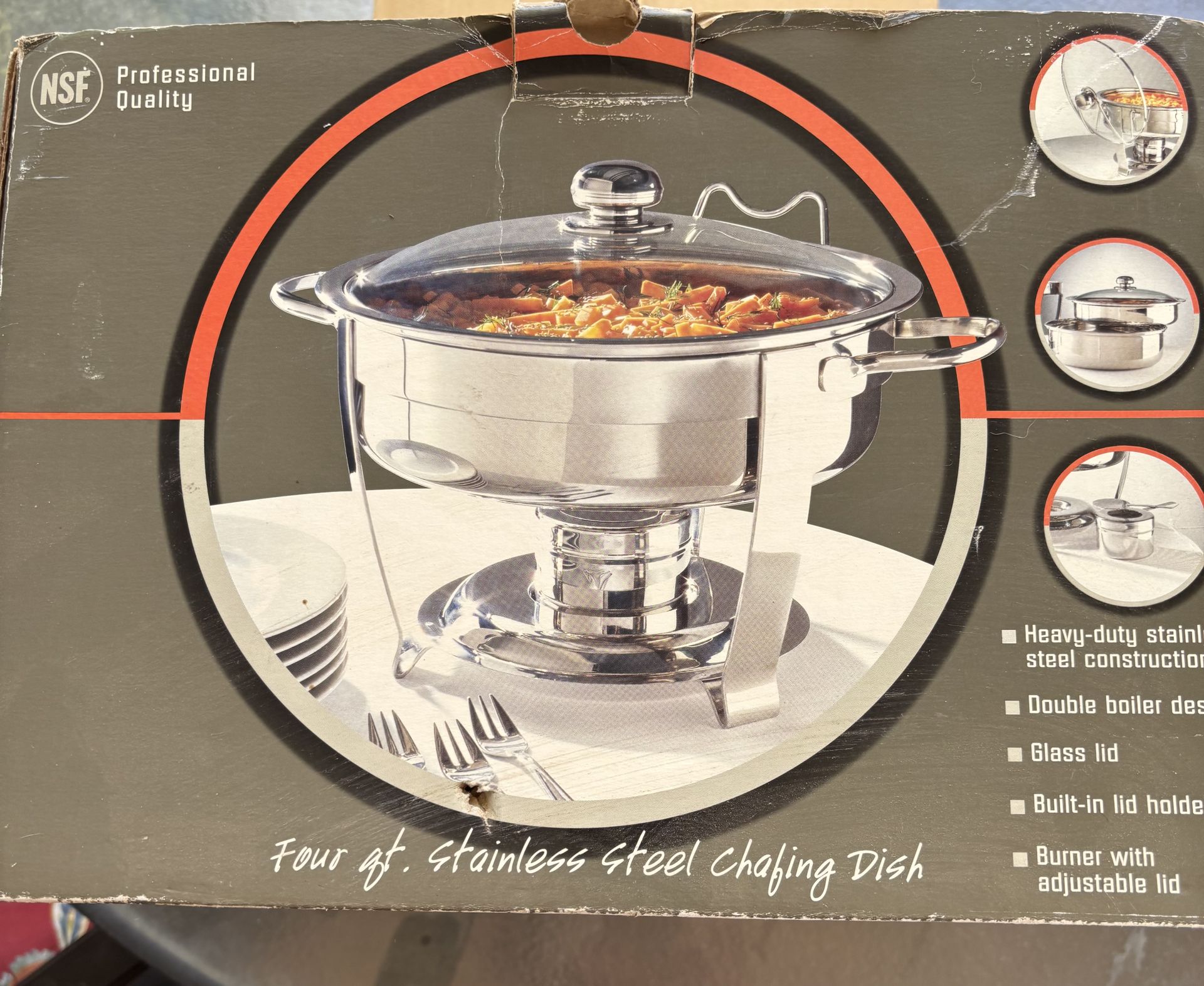 Like new. Professional 4 quart stainless steel chafing dish. Has heavy -duty construction and a double boiler designed to keep food warm without burning. Comes with a glass lid and a built-in lid holder. Removable burner with adjustable flame control. Super easy clean up too.