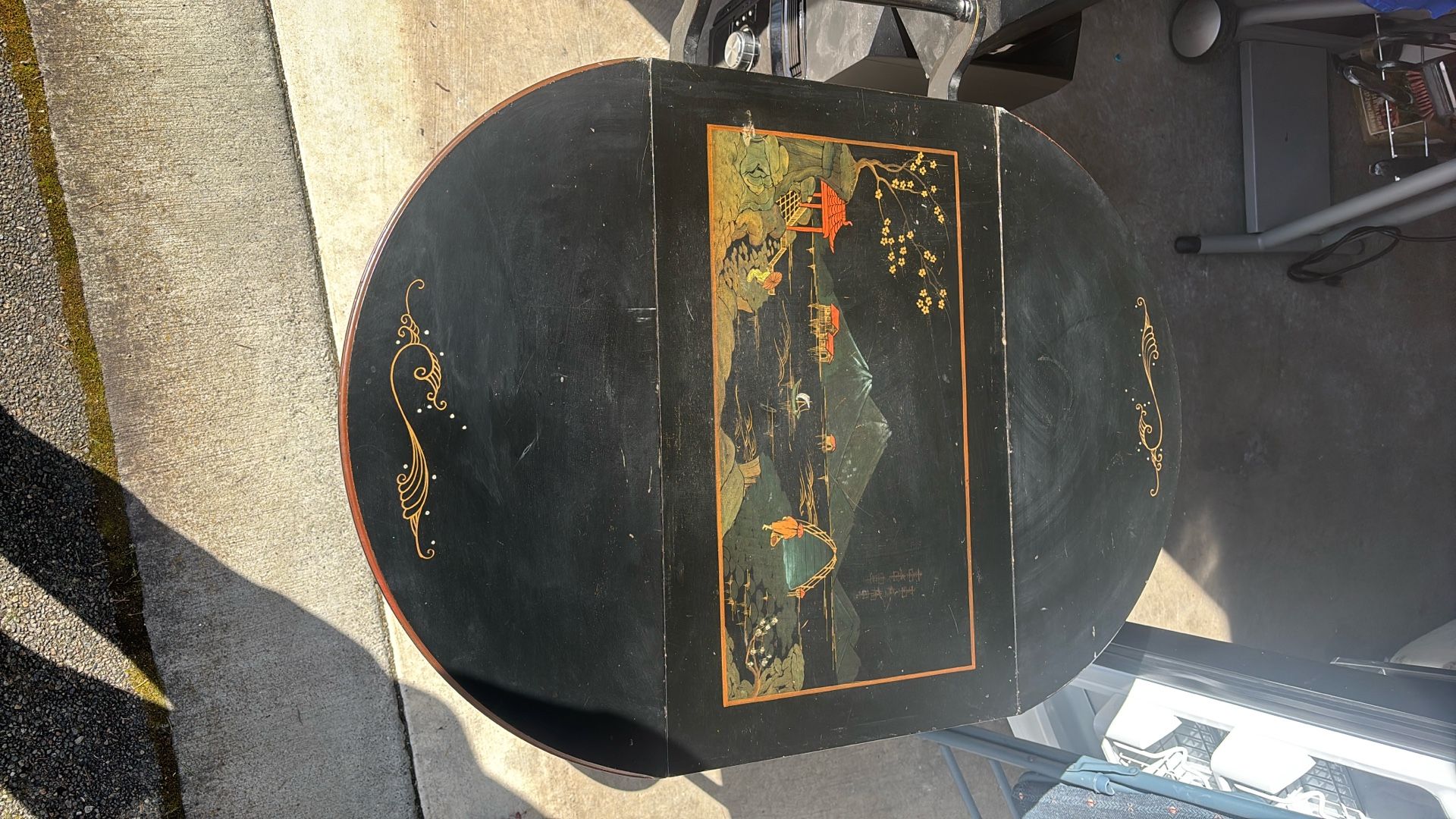 I have an antique Asian tea table. 31” long by 17” wide 30” tall. When side are up 38” wide. Has hidden drawer. Manufacturer in picture. Asking 250.00 obo