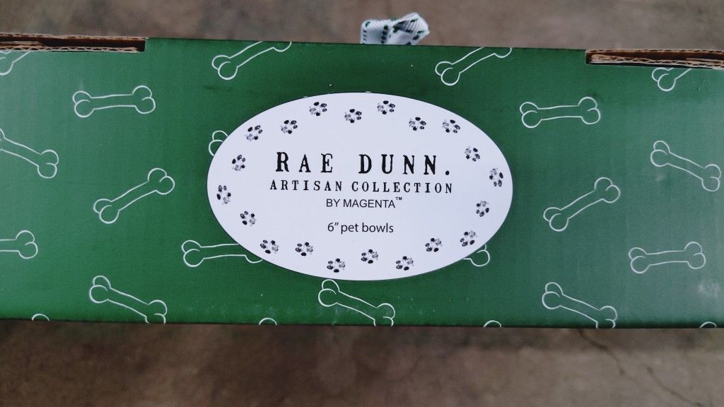 New in box Rae Dunn Ceramic bowls for pets Dark green with golden letters Artisan Collection 6" each bowl One bowl reads "Peace, Love" The other bowl reads "& belly rub" I have the last 4 sets available. Let me know how many sets you want. Also available for pickup in Sylmar California