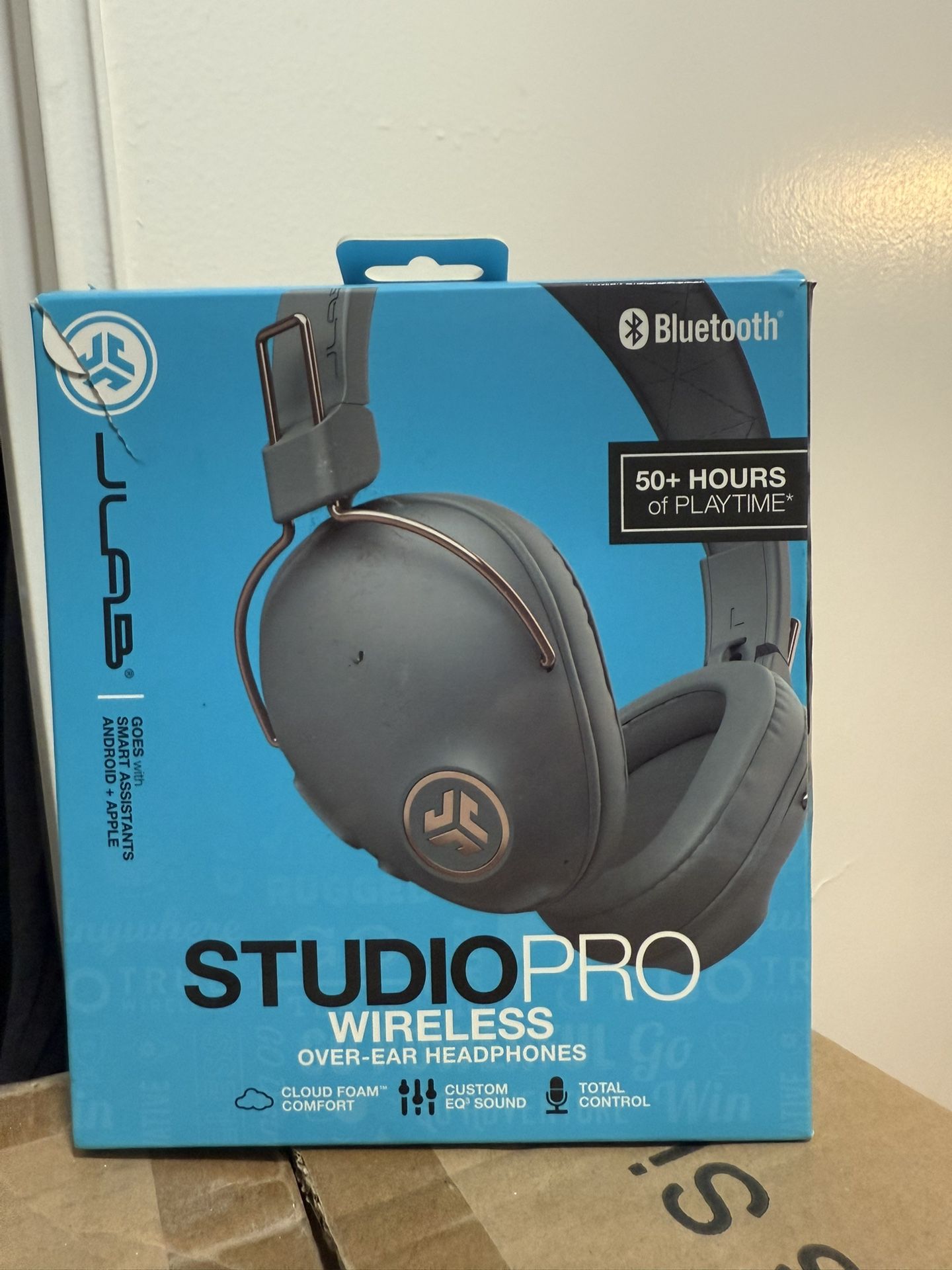 Selling a pair of JLab Studio Pro+ Bluetooth wireless over-ear headphones in great working condition! These comfy headphones feature up to 50+ hours of Bluetooth playtime, custom EQ3 sound settings, and plush cloud-foam ear cushions — perfect for daily listening, workouts, or travel. They connect easily to phones, tablets, and laptops and have built-in controls for volume, tracks, and calls. Includes USB-C charging cable.