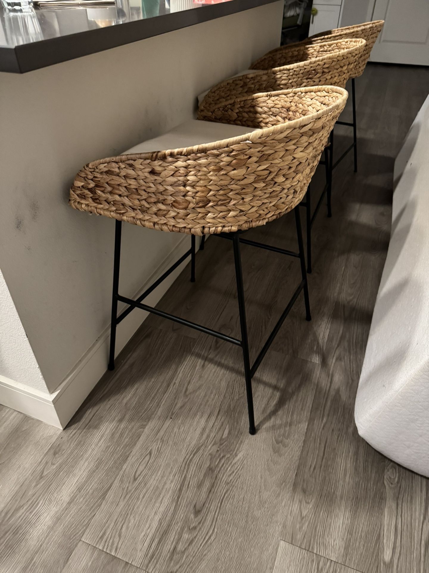 3 barstool chairs with cushions. Great condition, barely used. Woven bar stool with a barrel-style silhouette Padded seat cushion lends comfortable sitting experience Metal frame offers style and support Dimensions (Overall): 30.71 Inches (H) x 20.47 Inches (W) x 19.69 Inches (D) Seat Dimensions: 17.52 Inches [W] & 19.29 Inches [D] Sold as a set of three