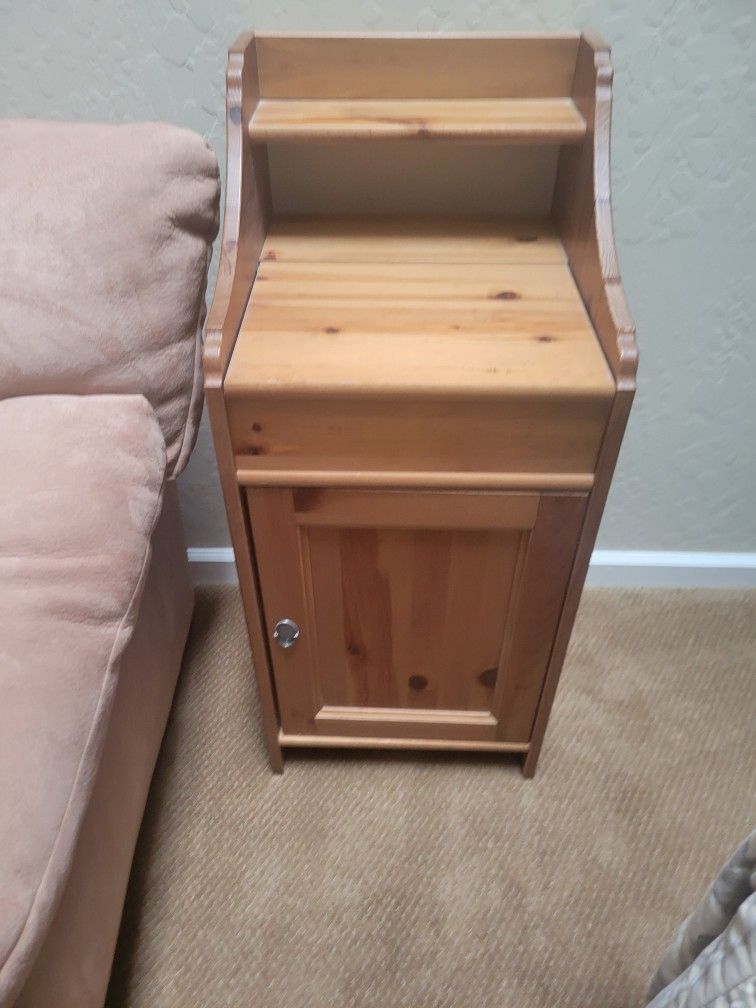 Wood table with closed door shelves. Top opens up for storage too. Great piece!!
