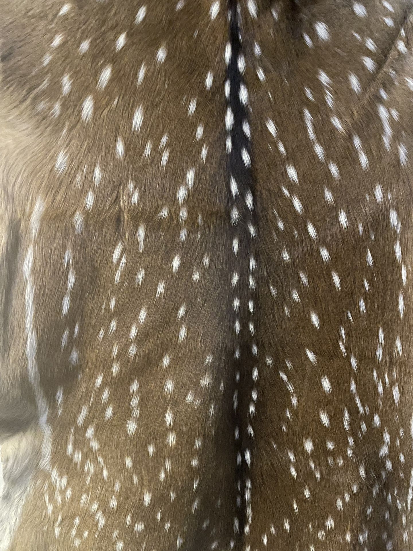 Axis Deer Hide – Hair-On – Fully Tanned Beautiful spotted Axis deer hide in excellent condition. Soft and flexible, not stiff. Stored indoors for over a year. Natural pattern with strong center stripe, no bald spots. Approx. 46” long x 35” wide. Perfect for home décor, wall display, cabin, ranch house, furniture throw, or craft leather projects.
