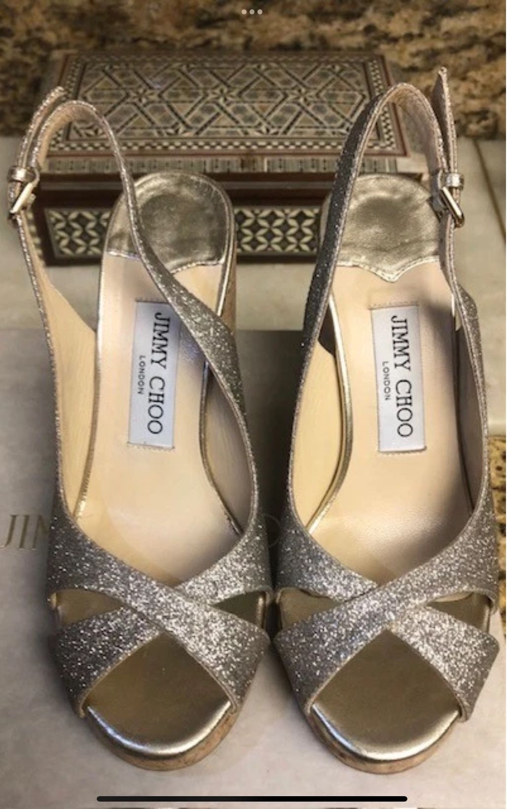 Gorgeous and authentic Jimmy Choo London shoes. Gently worn for several nighttime occasions, but the shoes are still in great condition. Originally bought for $550. Glitter Platinum Ice design. Beautiful condition. No major flaws. Please refer to pictures. Worst part of the shoes are the bottom of the heels (as expected). No rips or tears. Comes in original Jimmy Choo box (although the box isn't in great condition). Sie 36.5 UK which equals 6.5 US. Please message with any questions.