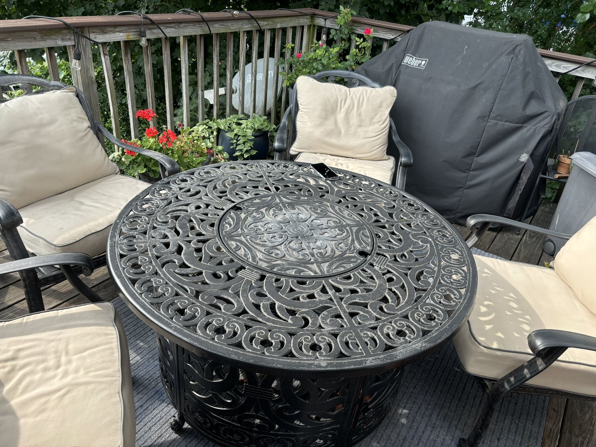 Table with fire pit and with propane tank/ 4 chairs with cushions and 4 covers/ all in great condition. I have smaller space now and cannot keep the set.