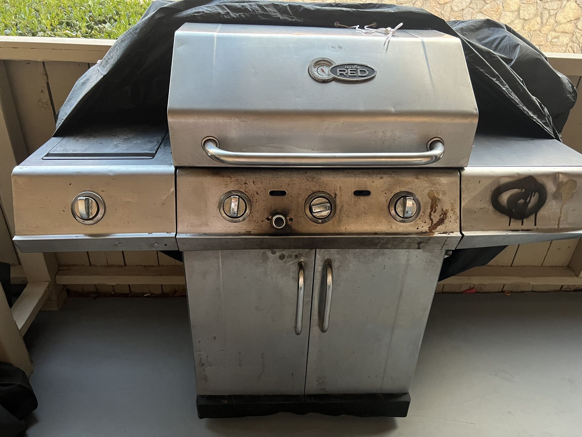 Charbroil Grill with “red technology”. Comes with a cover and that’s it. It’s a 3 burner grill with a side burner making it 4 in total. It’s in rough shape but it works great. It doesn’t come with the grill grates. I’m asking $40 obo. Update: the wind damaged the cover.