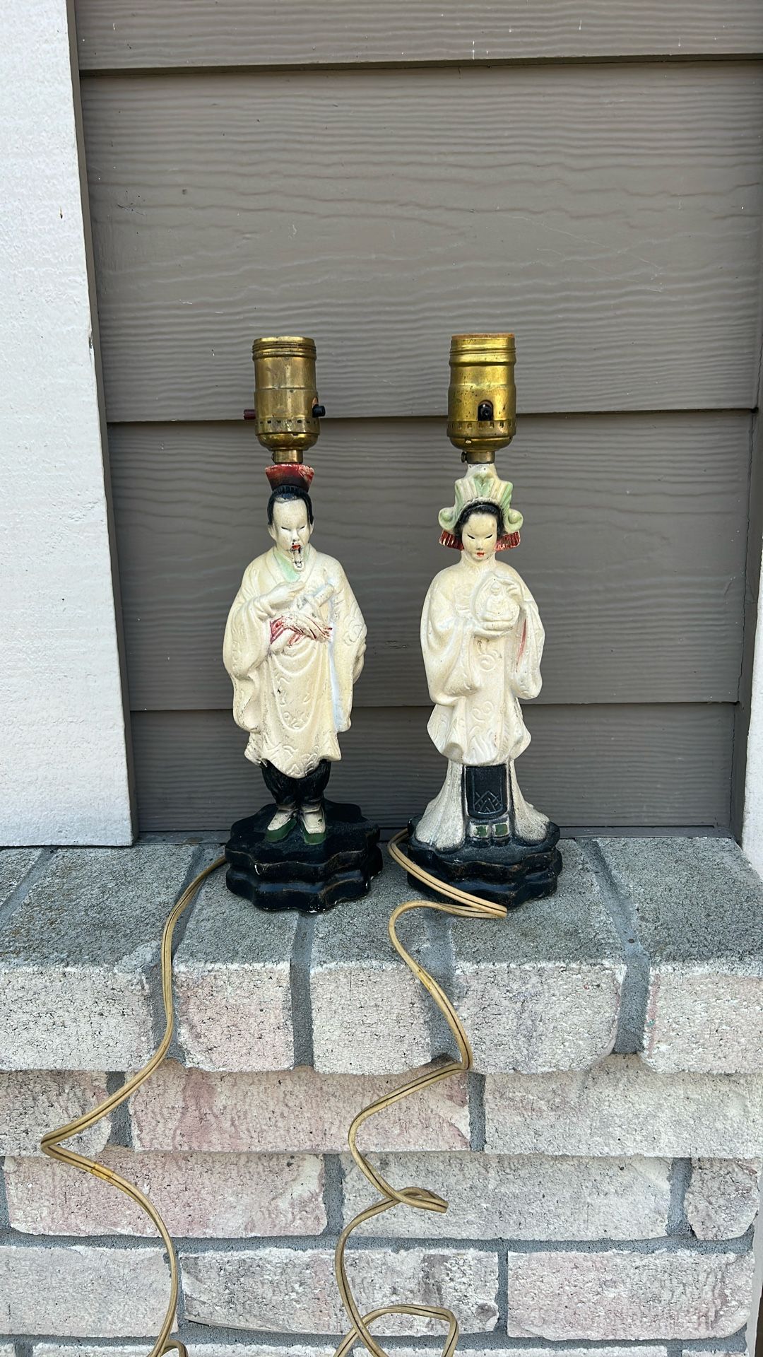 Pair of vintage decorative figurine lamps. Asian man and woman occasional lamps