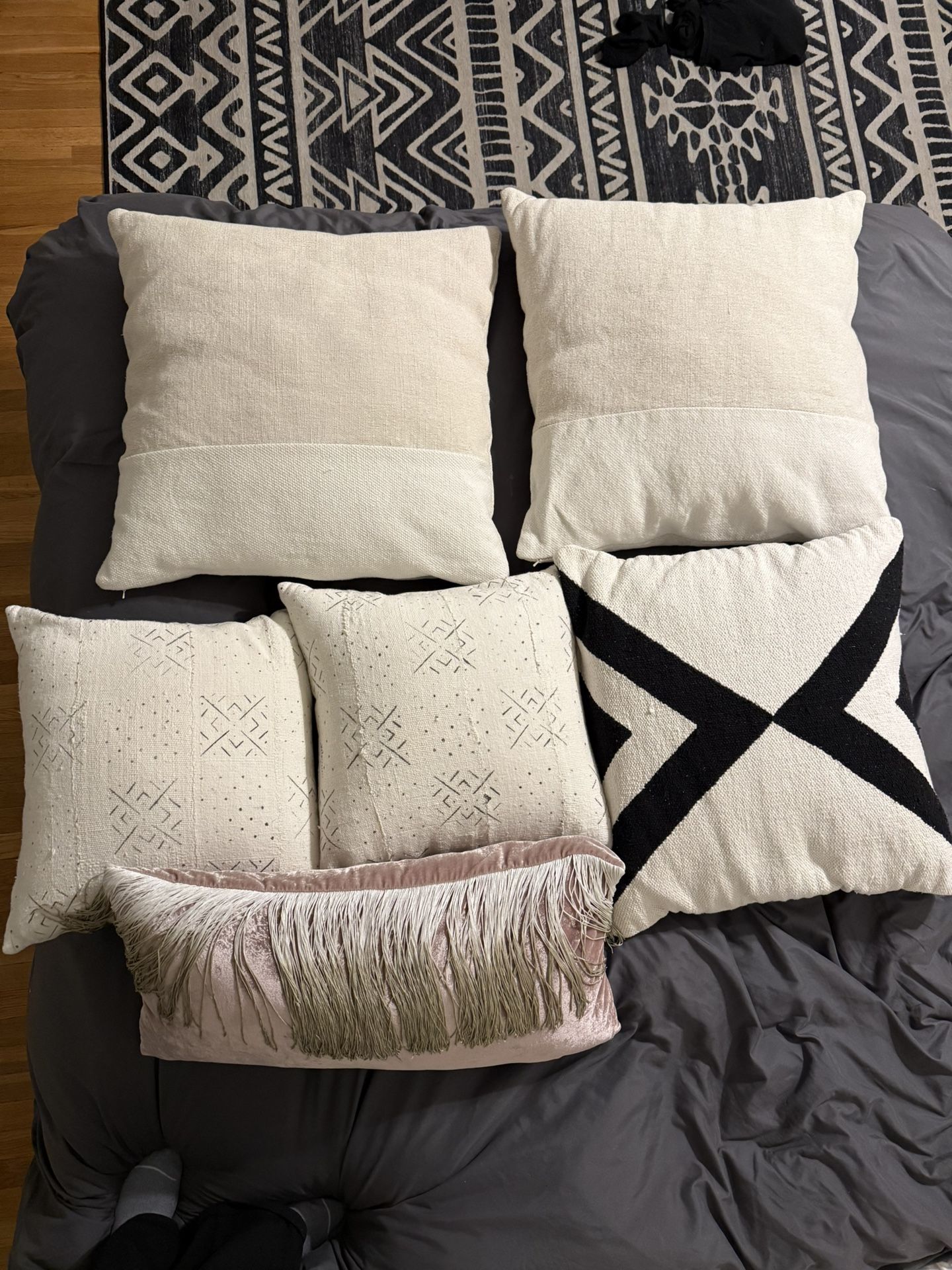 2 west elm cream pillows (larger oversized) $30 each 2 non branded mud cloth pillows $20 each 1 west pink velvet with fringe $20 1 CB2 large black + cream pillow with matching floor pouf $75 for both