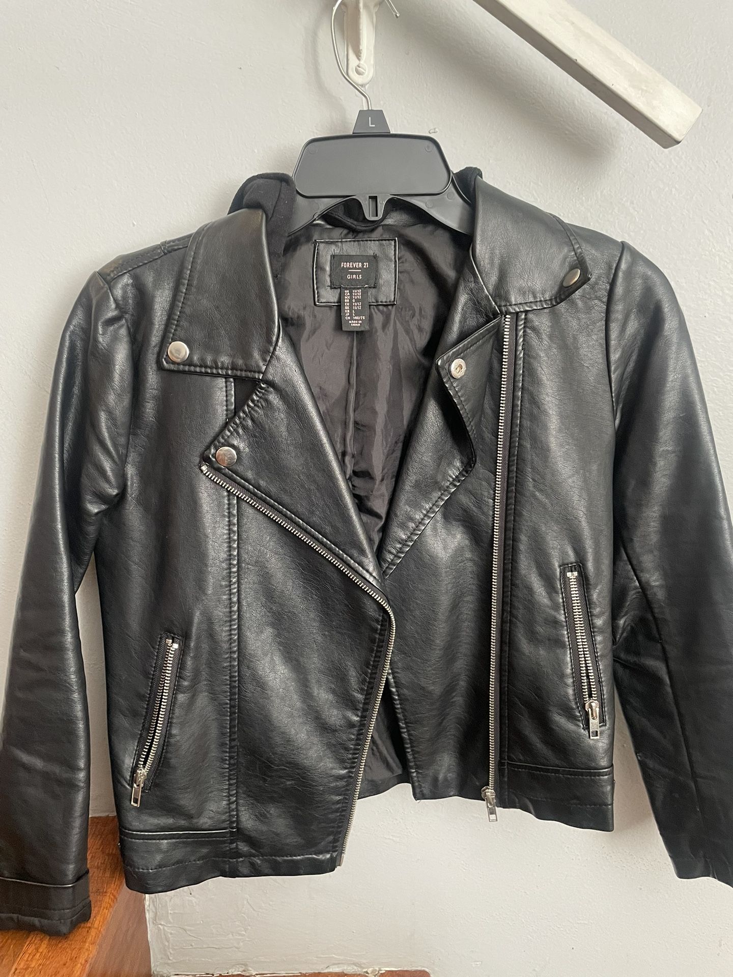 Girls faux leather jacket black size 11/12 Forever 21 detachable hood