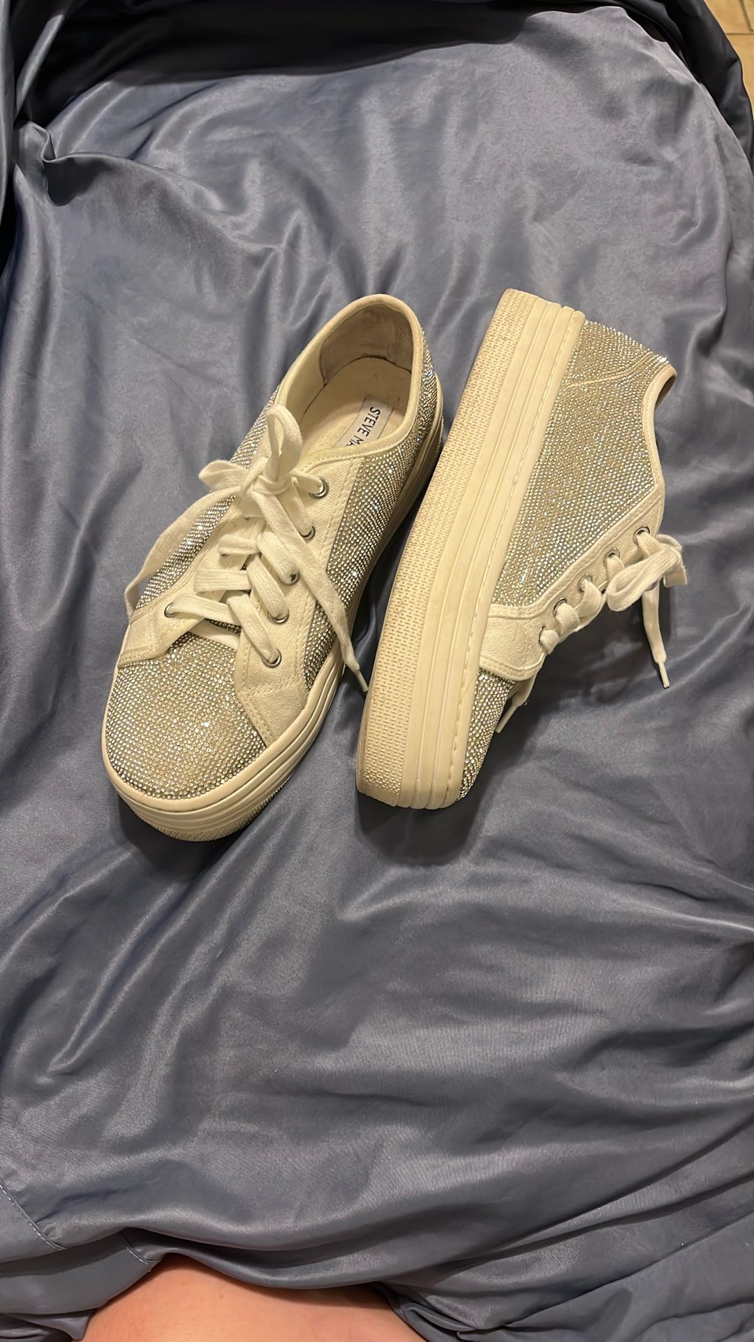 Used women’s size 10 white platform tennis. Very cute. The soles need a lil cleaning but still in good condition. Theres a few lil studs missing on left shoe