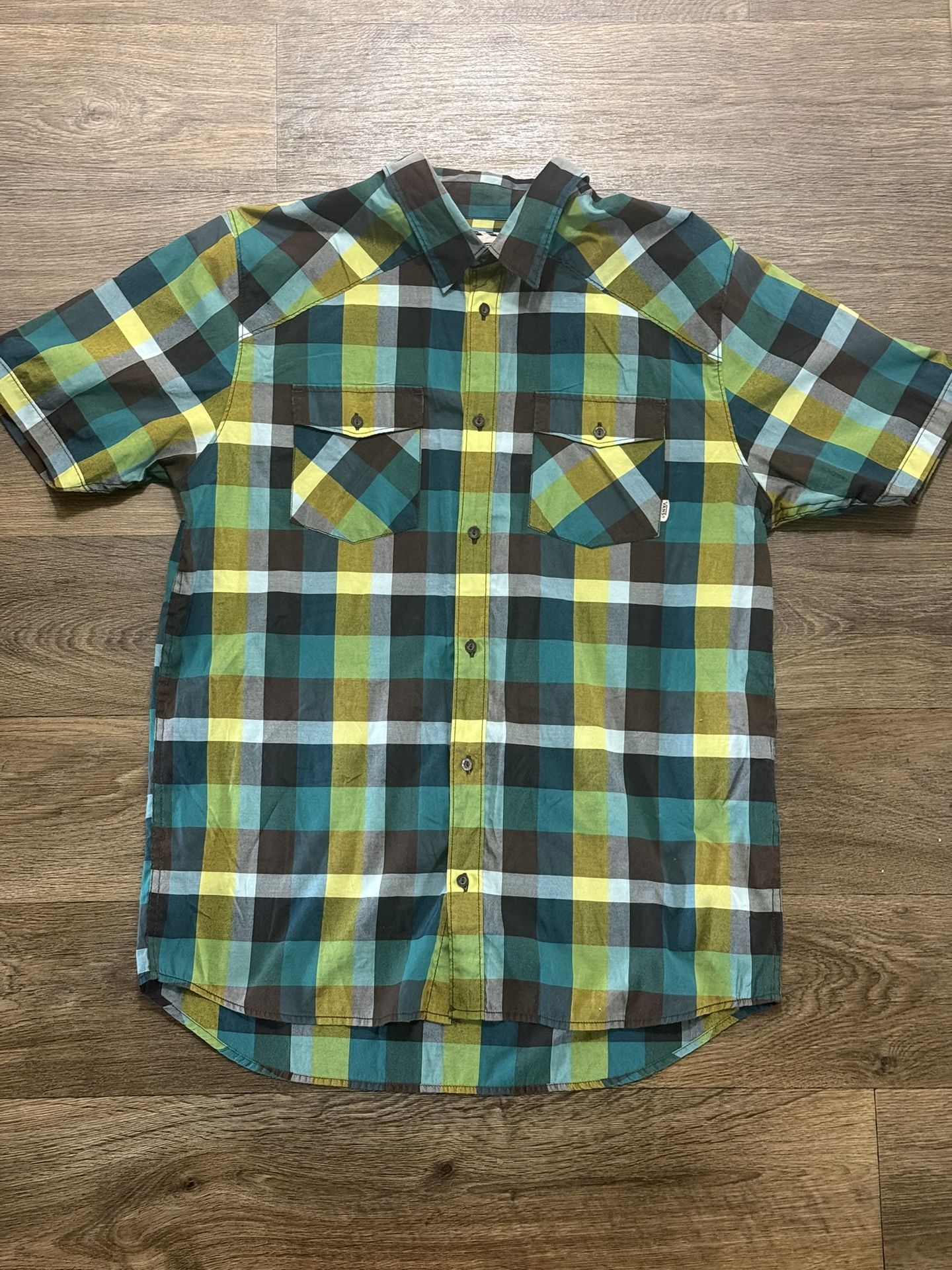In perfect condition, this is a size XL flannel print short sleeve button up. No stains or tears. All buttons in place. Green, yellow and brown print. Other vans items available on my page.