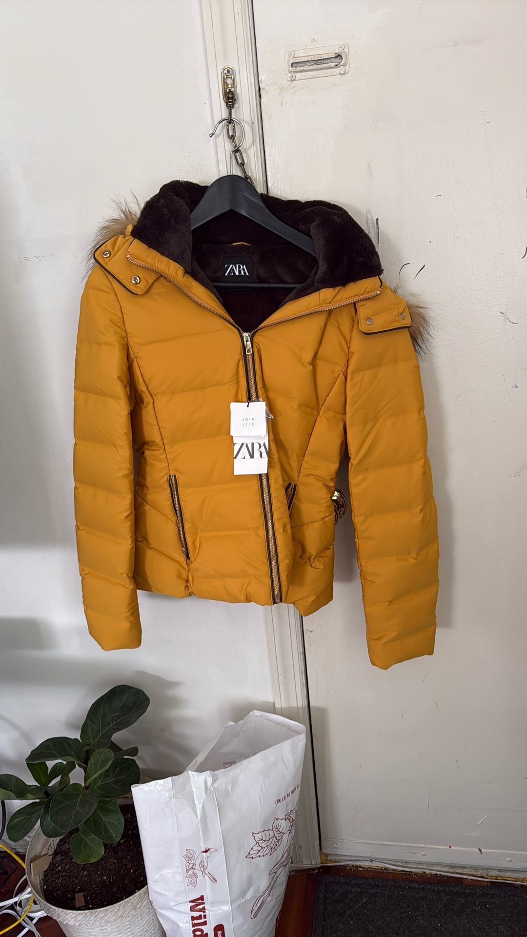 New-Zara Mustard Puffer Jacket with Faux Fur Trim