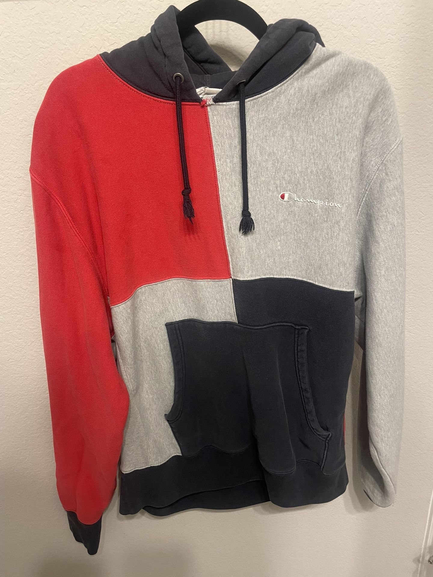 This Champion hoodie is a men's pullover featuring a geometric color block design in a multicolor palette. Made from cotton fleece material, it includes a drawstring closure and embroidered accents. The hoodie is of size Large and is part of the Champion Reverse Weave product line, known for its heavyweight and high-quality construction. Perfect for cross training activities, this hoodie combines style and functionality with its hooded feature and vibrant, colorful theme.