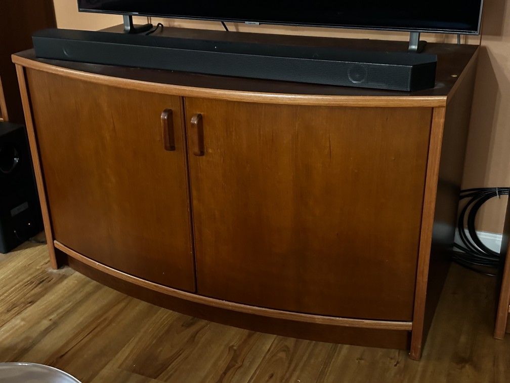 Cash only. Current value:~$350 Scandinavian Design TV Stand. Cherry Wood finish. Partial board. Very sold wood construction appearance. Very heavy as well. 26” deep x 48” wide x 28” tall