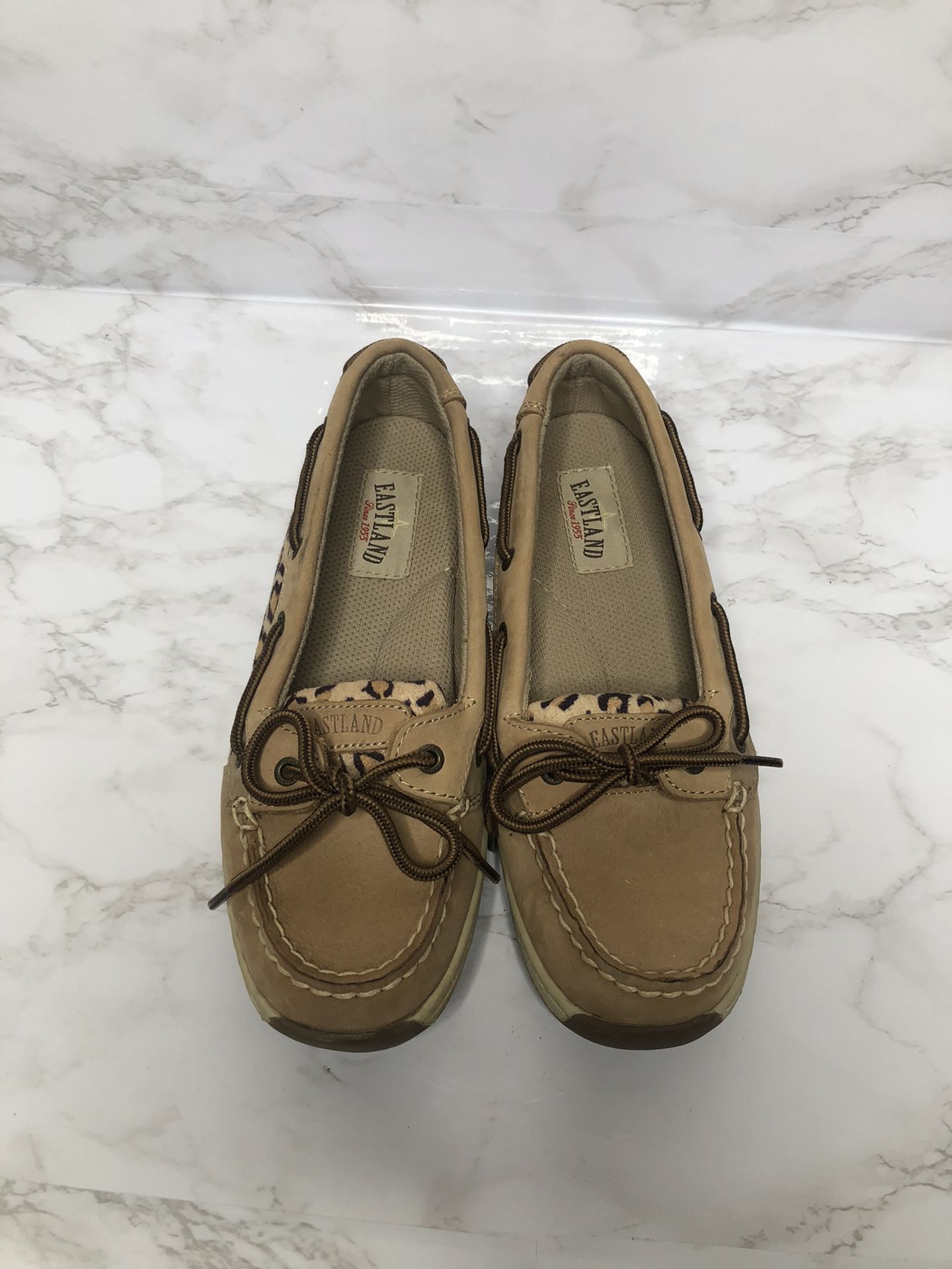 Nautical inspired slip on boat shoe. Leather upper with unique Leopard side panels contrast the smooth leather on this sporty boat shoe. They are in excellent like new condition, may have been worn once. Round moc toe Lace-up with wraparound lacing details Cushioned insole Padded cuff Grip sole Size: 6.5