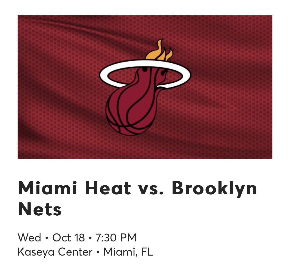 Miami Heat vs. Brooklyn Nets Sec 309, row 4, seats 6-7. Wed • Oct 18 • 7:30 PM Kaseya Center • Miami, FL