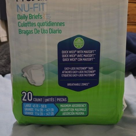 The Prevail NU-FIT Daily Briefs in size Large offer maximum absorbency for individuals with incontinence. These latex-free briefs feature Quick Wick technology with MaxSoft for improved comfort and breathability. The Easy-Lock Fastener Tabs provide a secure fit, making them a convenient and reliable option for daily use. With a sleek white color and a focus on health and beauty, these daily briefs combine functionality with a discreet design.