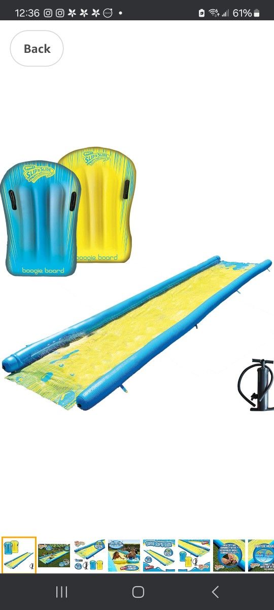 Gently used slip n slide. All parts included except one of the boogie boards popped. Works great!