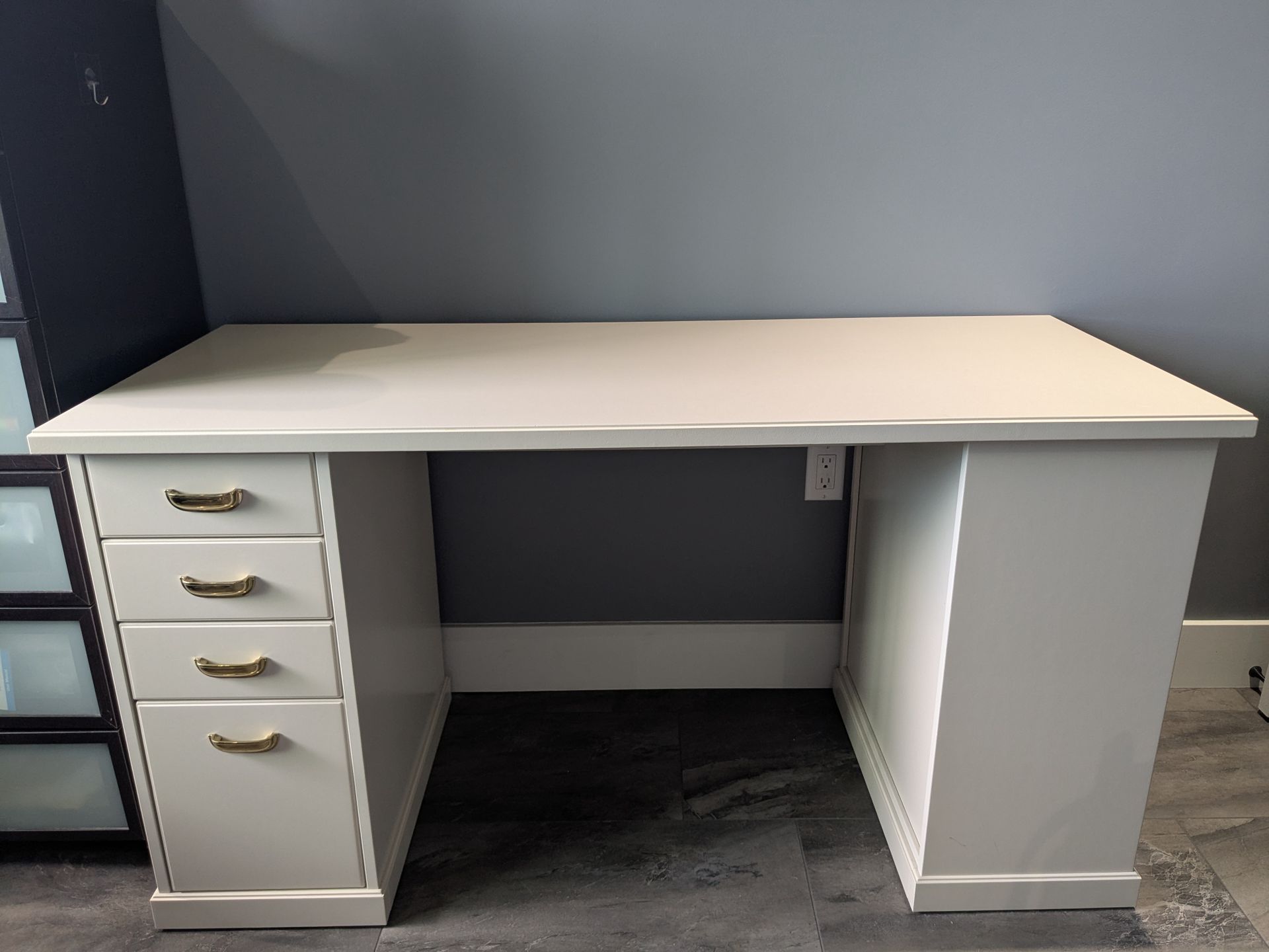 Beige IKEA VEBJÖRN desk (55 1/8" x 23 5/8" - see more measurements in the picture) with: 4 drawers; gold cup handles; a side 2-shelf open bookcase. Retails at $299.99 new — great deal for $190! 📍 Local pickup only - Mission Bay area
