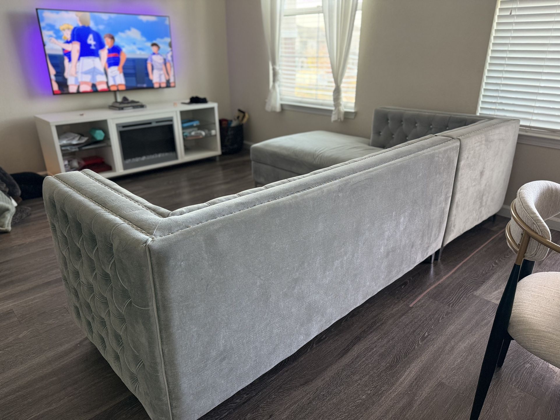 Wonderful couch, firm cushion. Chaise has storage. Comes with all pillows listed in the stock photo. There is a small protrusion in the center of the couch, I assume this has to be one of the damaged springs/coils (it can be repaired), hence why Iโm letting the couch go for such a low price. Pickup at the front door. Zelle/cash only. If the ad is up, YES it's available! Please don't ask, thanks!