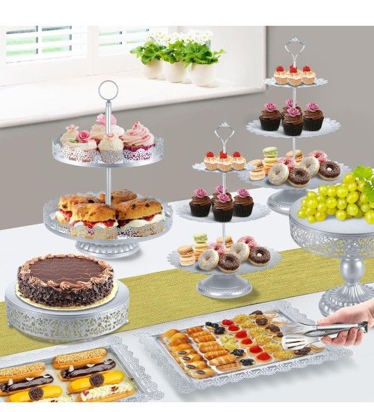 Silver Cake Stand Sets, Metal Dessert Table Display Tiered Cupcake Holder Food Fruit Donut Plate Serving Tower Tray Platter. Used one time for my daughters quinceañera