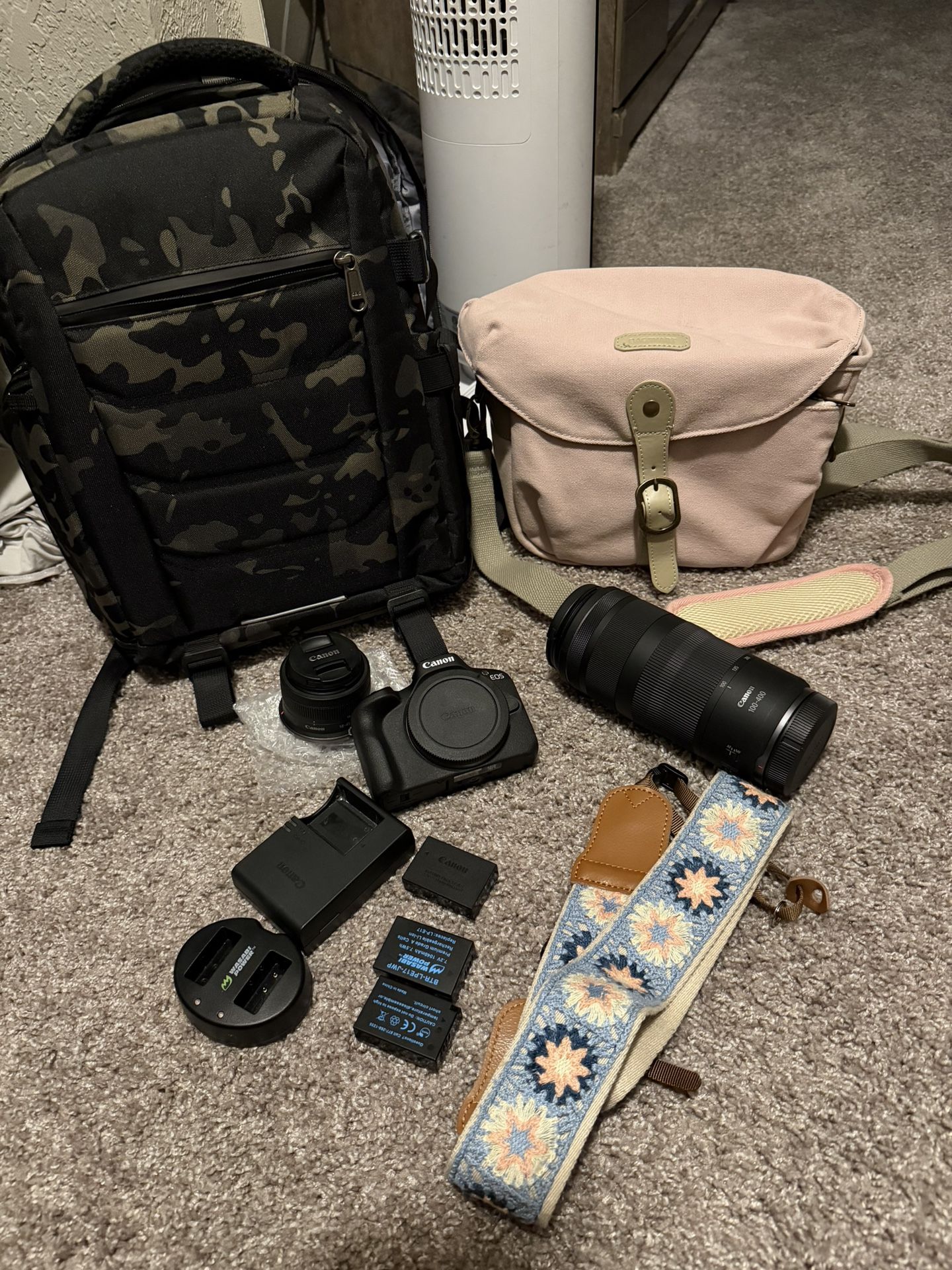 Canon R50 with Kit lens (missing the back cap-it is the only lens missing anything) RF 100-400mm lens bought new at Best Buy 2 bags, I backpack style and 1 over the shoulder style 1 canon battery and charger and 2 aftermarket batteries with charger Only used personally, not used for anything outside of what I did at home $1100 shipped for all of it or $1050 Pick up in Tampa 33610 To sell separate Canon R50 with kit lens $580 shipped $550 local RF100-400 lens $580 shipped $550 local Cash App, Venmo preferred. Will also take PayPal if you pay the PayPal fee. Have videos of the lenses to show their in excellent condition This camera takes beautiful photos, I just don’t use it now that we moved back to Fl
