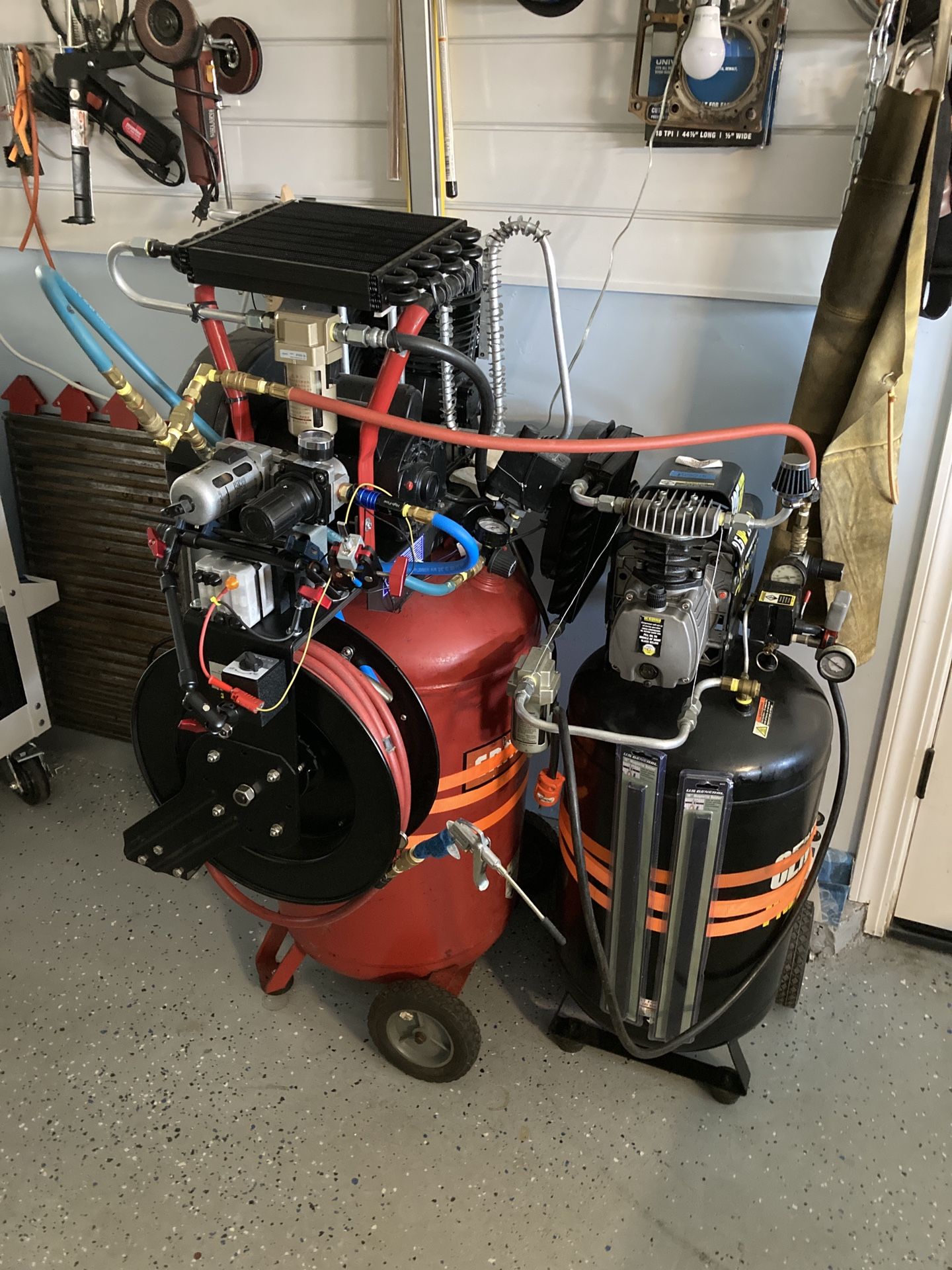 each has its own aftercooler and can be used as standalone that's $200 in fittings(@parker) and tunings and $200 in aftercooler setup. combined they have 55gal of air and 11+cfm@90psi. black one has never had a single problem the red one has been fully rebuilt. both have routine oil changed and drained after each use. they are sold as a bundle will not separate.
