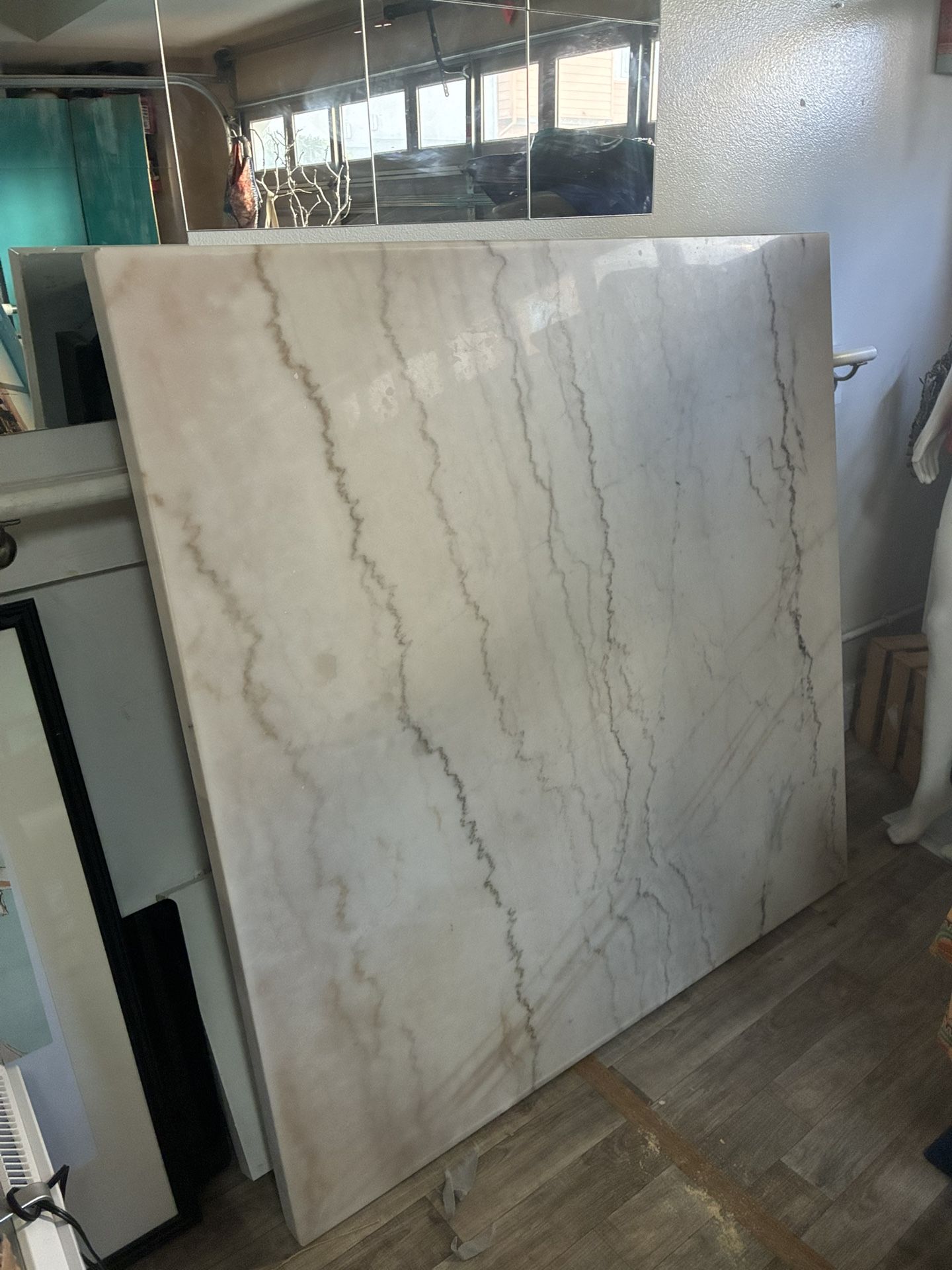 Beautiful marble table top. White with light brown/grey streak veins. The marble table top is in great condition. The only issue is the leg needing replacement. -***One 34 inch leg needs replacement*** -8 seater -Heavy solid marble table top measures 54”x 54” -Comes with 3 good dark wood legs and all hardware for assembly. Again, the 4th leg needs replacement. After assembly, table height will measure 36 inches -Pick up near Victoria Gardens