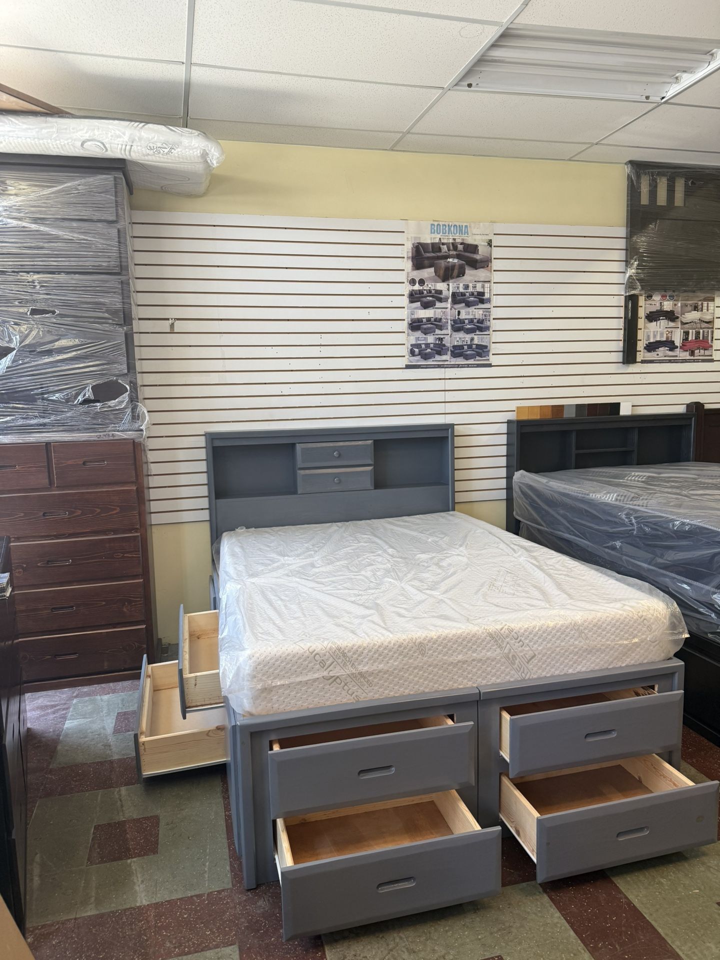 Queen bed frame with white mattress and 10 drawers Color is optional. You can choose between the colors displayed on the piece of wood. Delivery is also available and free if you live in Norwalk or near. We deliver to LA, IE, SGV, and SFV and delivery prices vary on the distance from our store.