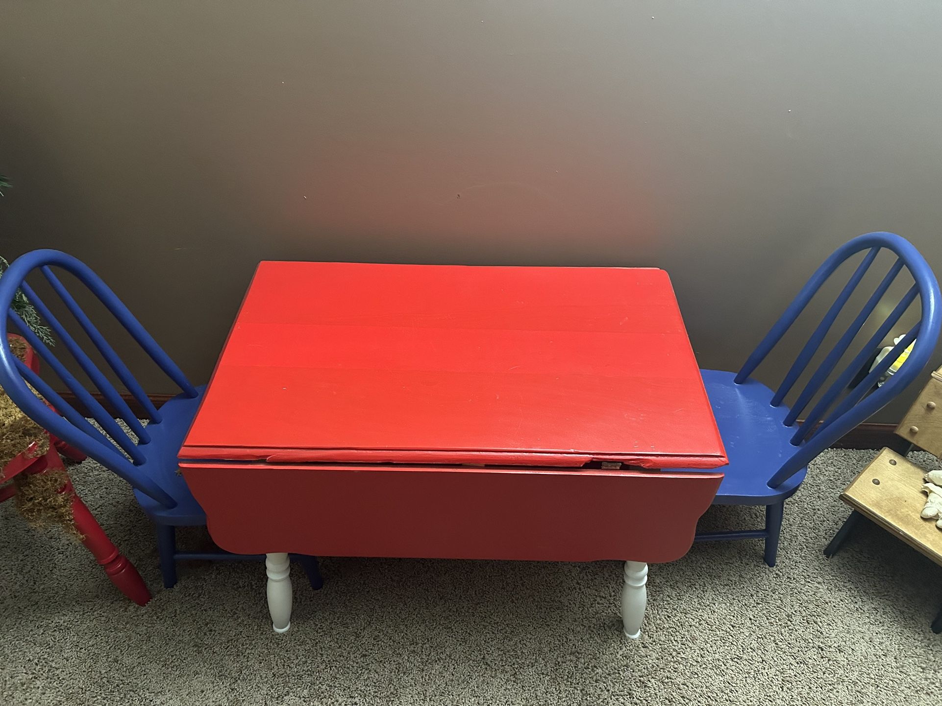 Vintage solid wood child’s table and two chairs. Drop-leaf sides. Only mar is shown in picture. $25.00. (contact info removed)
