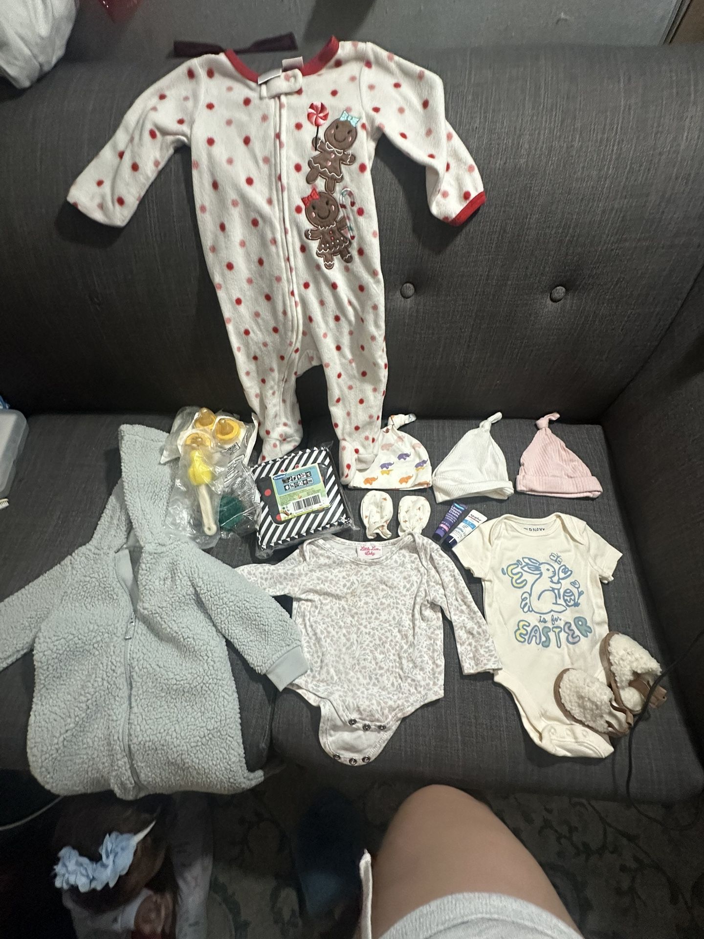 Three newborn hats, Easter shirt (0-3M), flowered shirt (6M), gingerbread onesie(6-9M), blue fluffy onesie (12M), 1 pair of mittens, 1 pair of shoes (0-3M),three disposable 1 time use w nipple bottles Sterile, 1 newborn pacifier, 1 high contrast baby book, breast pump cleaner, 1 mini lalolin cream, and 1 mini diaper rash cream. We are moving and I forgot to pack these pairs of clothes. Also some stuff I no longer need. Creams and items are new. The clothes used like once or twice.