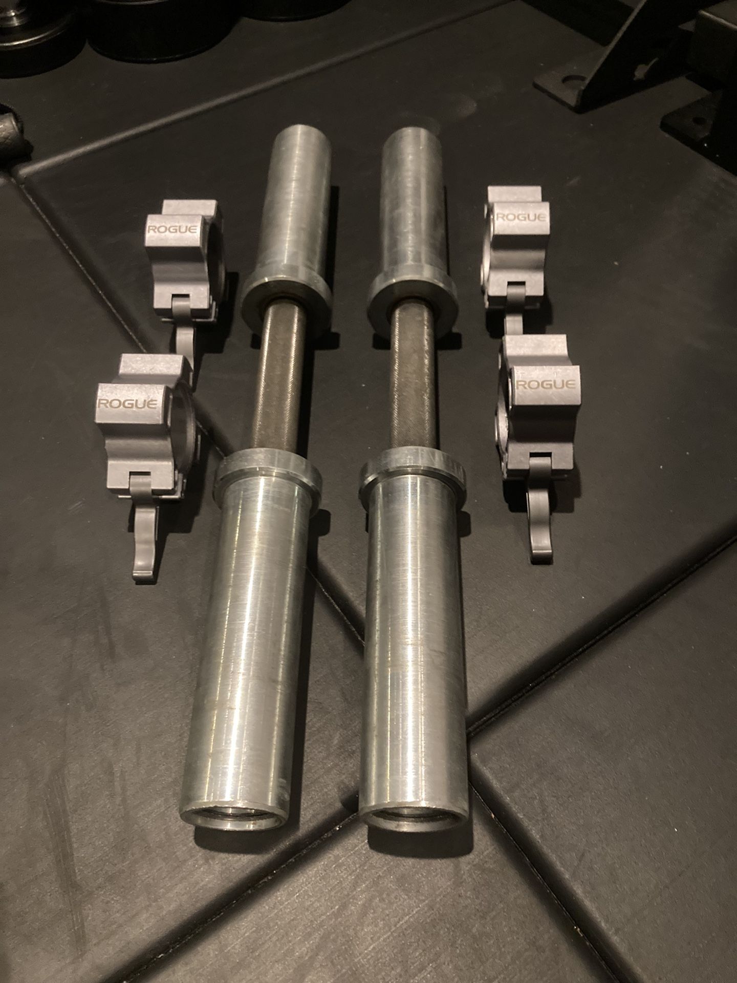 Excellent condition. The best pair of loadable dumbbell handles you can buy. They weigh 15 lbs each. Comes with 2 Pairs of Rogue OSO Billet Aluminum Collars. Can be used with any brand Olympic plates but are specially made to be used with Rogue dumbbell bumpers. Retails for over $500 shipped. CrossFit, weight plates, weights, bumper plates, squat rack, adjustable bench, FID, bench press, shoulder press, deadlift, exercise, workout, training, Olympic