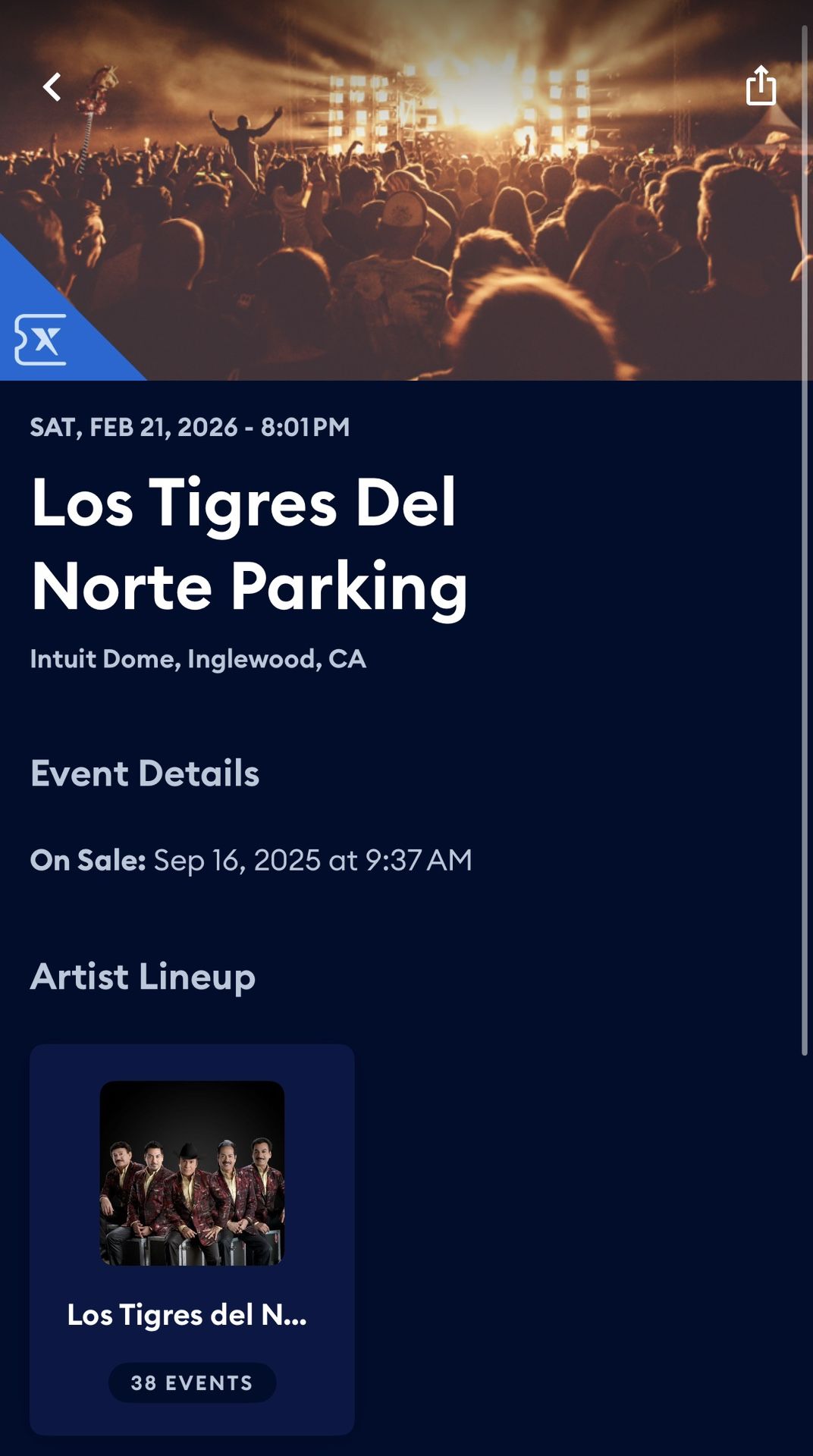 Selling 4 parking passes for Los Tigres del Norte tonight in Inglewood. Paid $100 each – willing to negotiate. SeatGeek mobile transfer – safe and instant. Make me an offer!