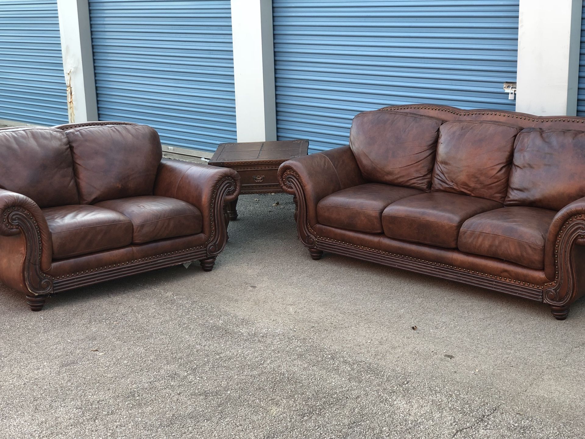 Couch And Love Seat real leather great condition. Minor wear. End table included Can deliver for a fee!