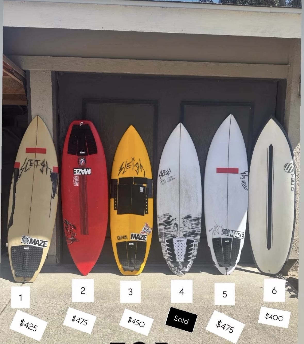 Fairly New Sleigh Surfboards making room in the garage. 1) 5’8•20•2.5 Thruster/ Poly $400 2) 5’6•20•2.5Thruster / Epoxy $450 3) 5’5•19.25•2.5 Thruster / Epoxy $450 4) Sold 5) 5’11•20•2.5 Twin Fin / Poly $475 6) 5’11 •20•2.6 Thruster / Epoxy $400