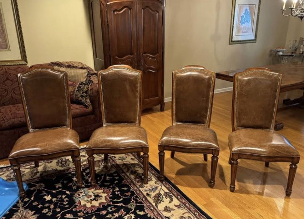 All 4 chairs for $560 Gorgeous distressed leather dining chairs by Lexington furniture 01-0750-884 Leather Side Chair Seat 22W x 21¼D × 18%H in. Overall size 22W x 26%D x 43%H in. Rarely used dining chairs purchased from Safavieh in Stamford with a very distressed leather look. A ralph Lauren look made by Lexington Leather Tommy Bahama collection. Cash only no Venmo no Zelle