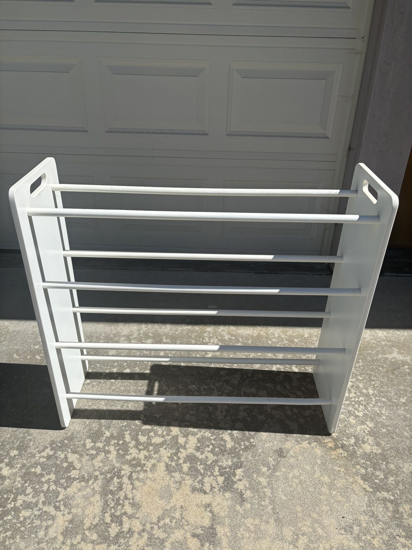 Comes with all bins pictured, plus 2 more of the bigger ones that are being cleaned! Shelf is 34 inches long, 11 inches wide, 31 inches tall.